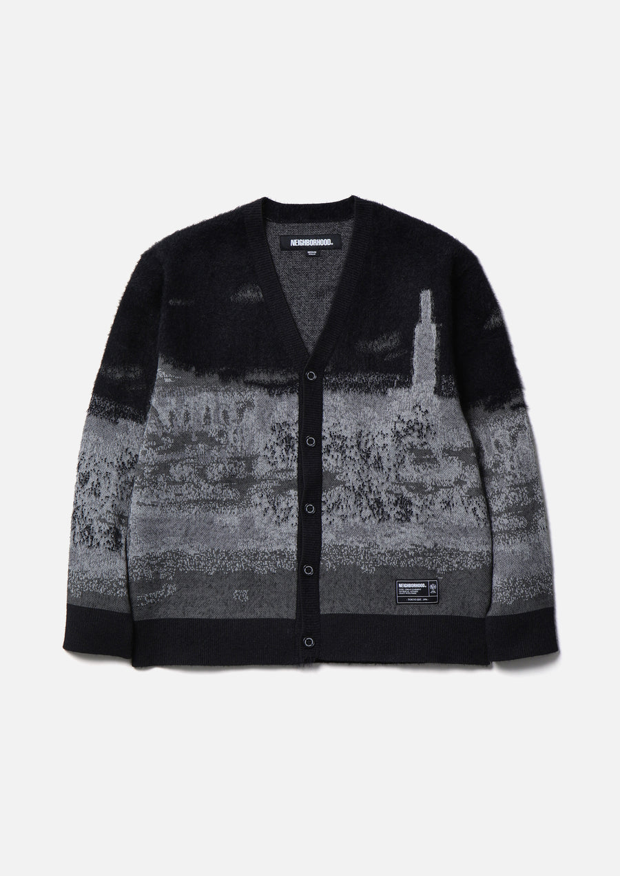 風景柄をジャカード編みで表現したSOLOTEX®混紡のニットカーディガン。オリジナルボタンを採用。左裾にネームタグを配置。