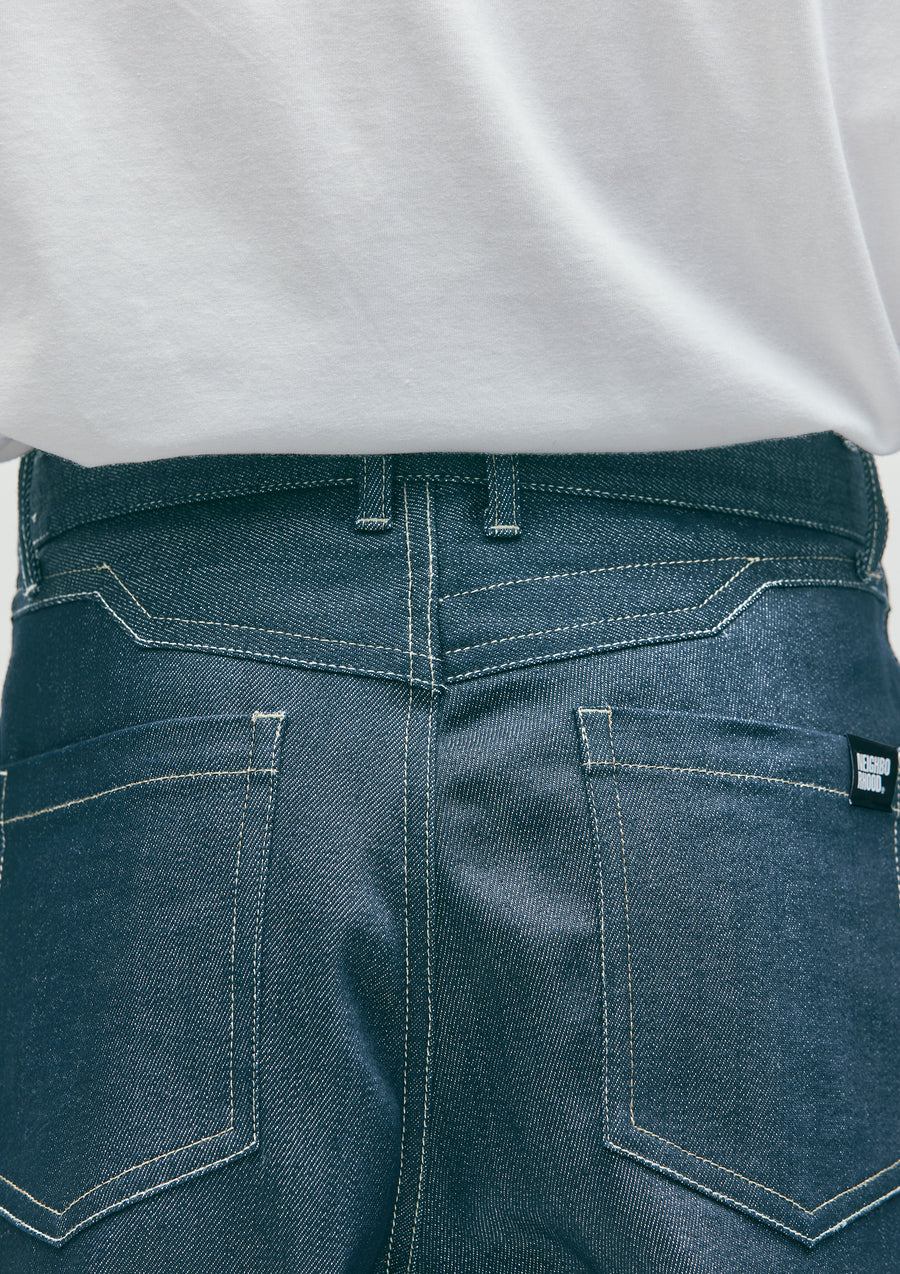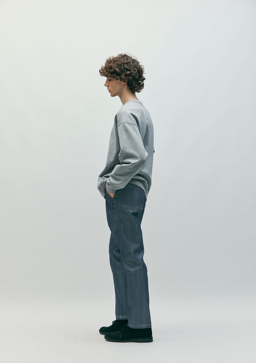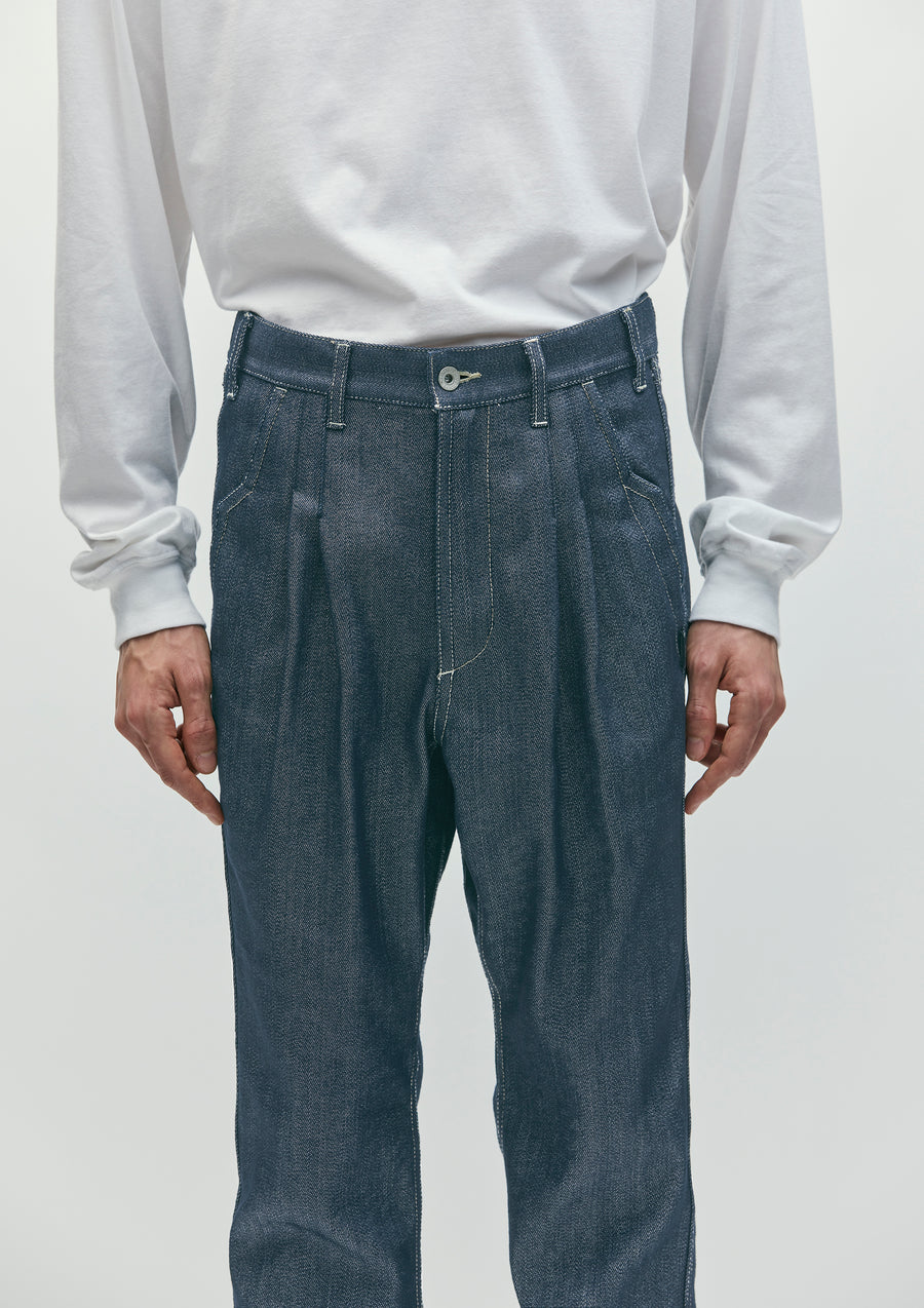 SOLOTEX®混紡のデニム生地を使用したツータックパンツ。フロントポケットとバックヨークにデザインステッチを施したディテールが特徴。オリジナルのタックボタン、フロントファスナー、シグネチャーテープ、スレキ生地を採用。サイドシームにピスネームを付属。股下にマチをもたせたすっきりとしたシルエット。