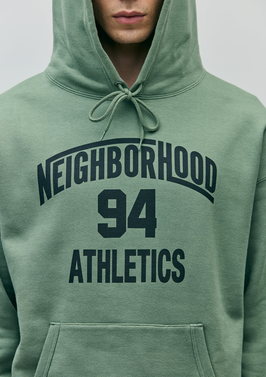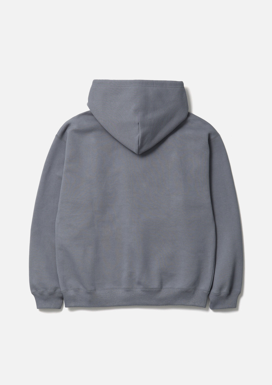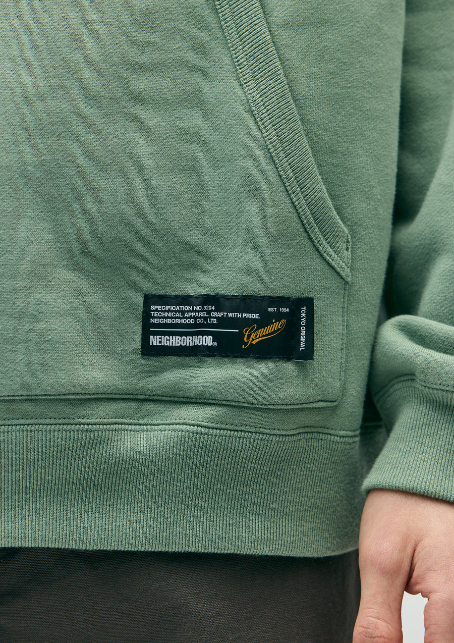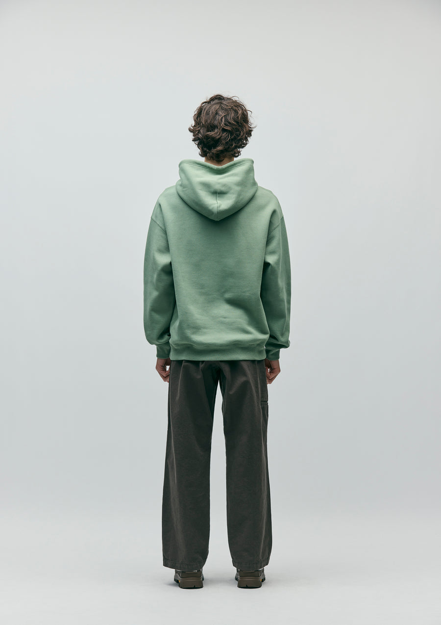 染色前に裏起毛加工を施し、毛羽の脱落を抑えた裏毛素材のプルオーバーフーディ。フロントにグラフィックをプリント。サイドシームにピスネームを付属。