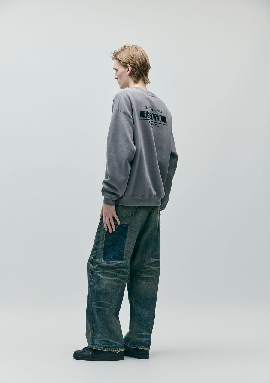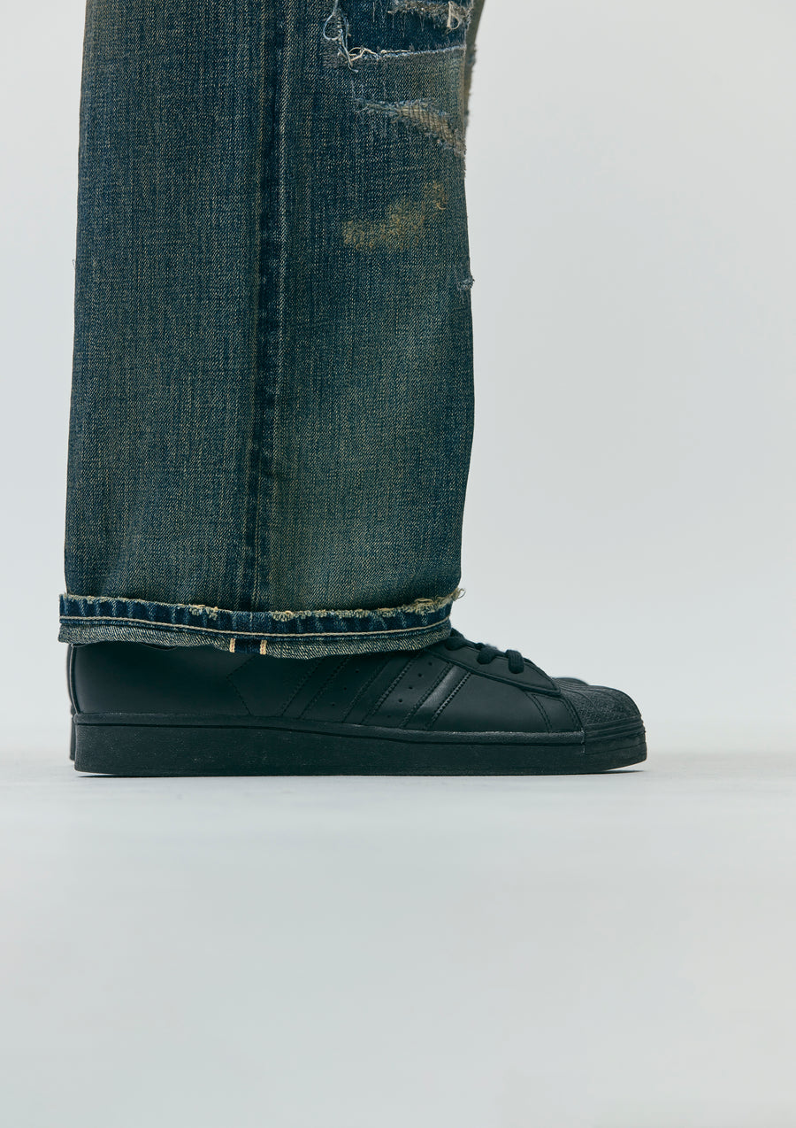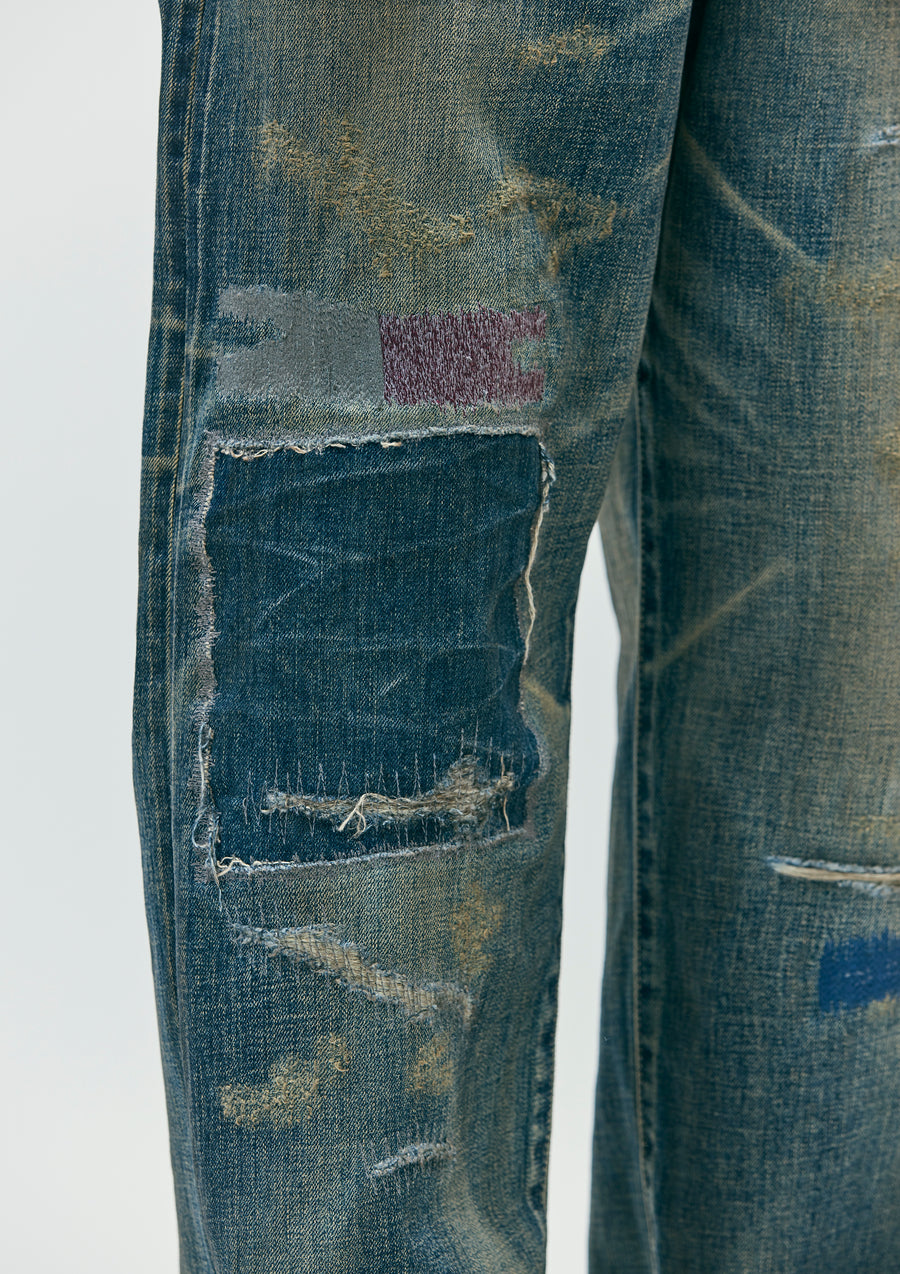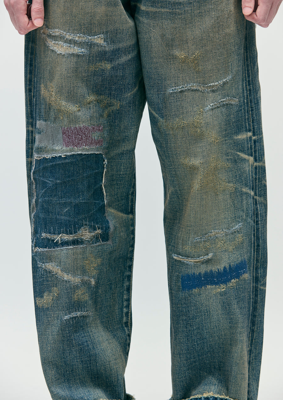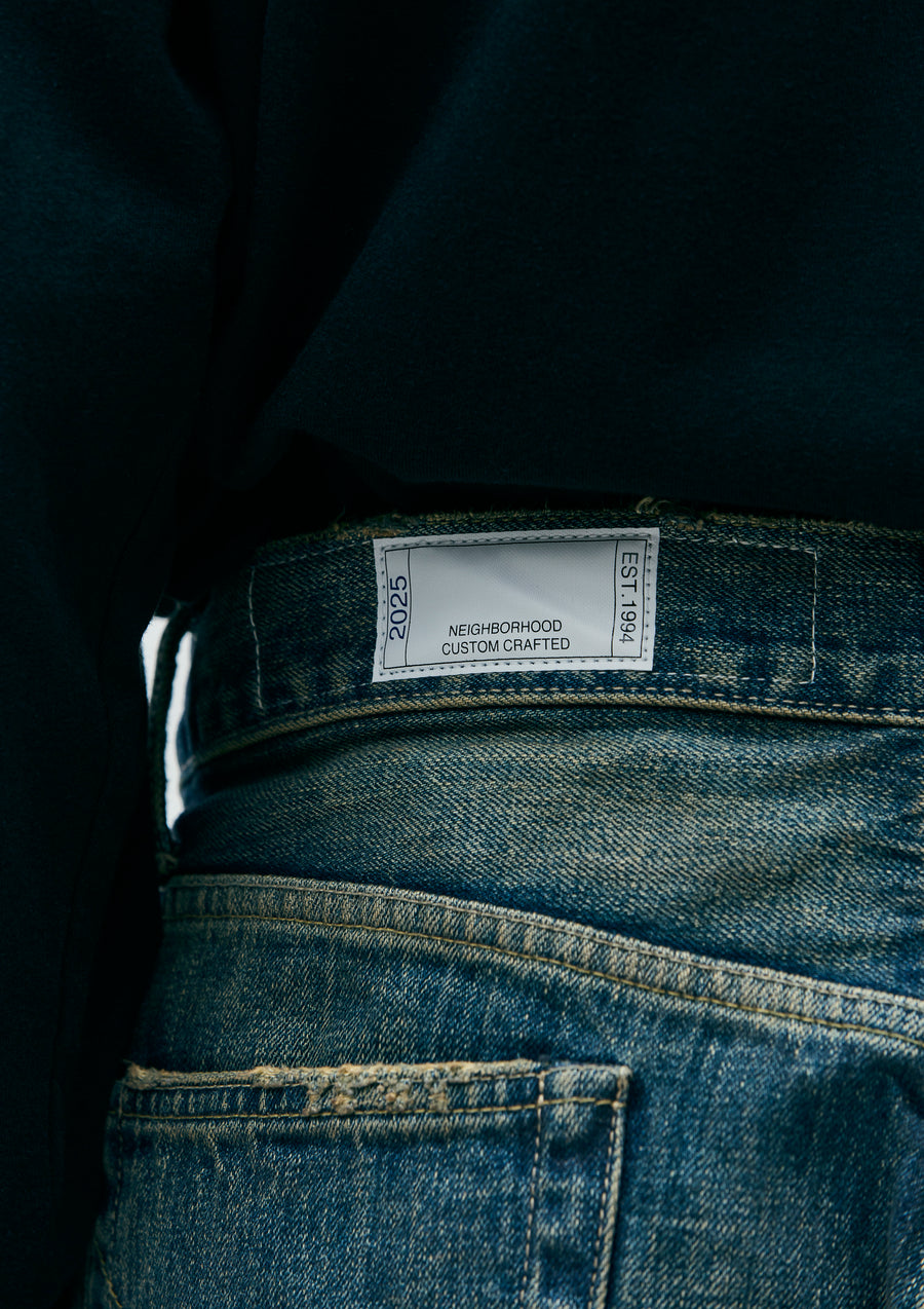 生地からボタン、リベットといったパーツまで、すべてオリジナルで製作した12ozセルヴィッジデニムをベースに、複数のエイジング加工を施したサベージデニムパンツ。ハードな色落ちや裏当てへのウォッシュド加工、ランダムピッチのリメイク技法など、生地の脆化をイメージしたリアルなエイジングが特徴。カスタムクラフテッドアイテム専用のサイズネームを配置。DP BASICやDP MIDに比べ、最も加工表現を強調したDP WIDEシルエット(ワタリ、ヒップ、裾幅をかなりゆったりとさせたワイドスレートシルエット)。
