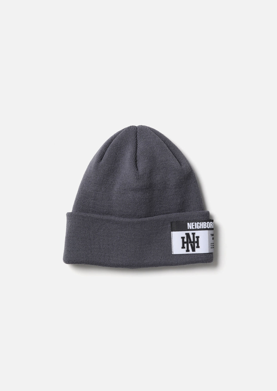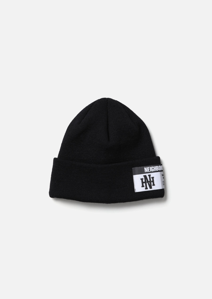 アクリルニット素材で編み立てたビーニー。左サイドにネームタグを配置。