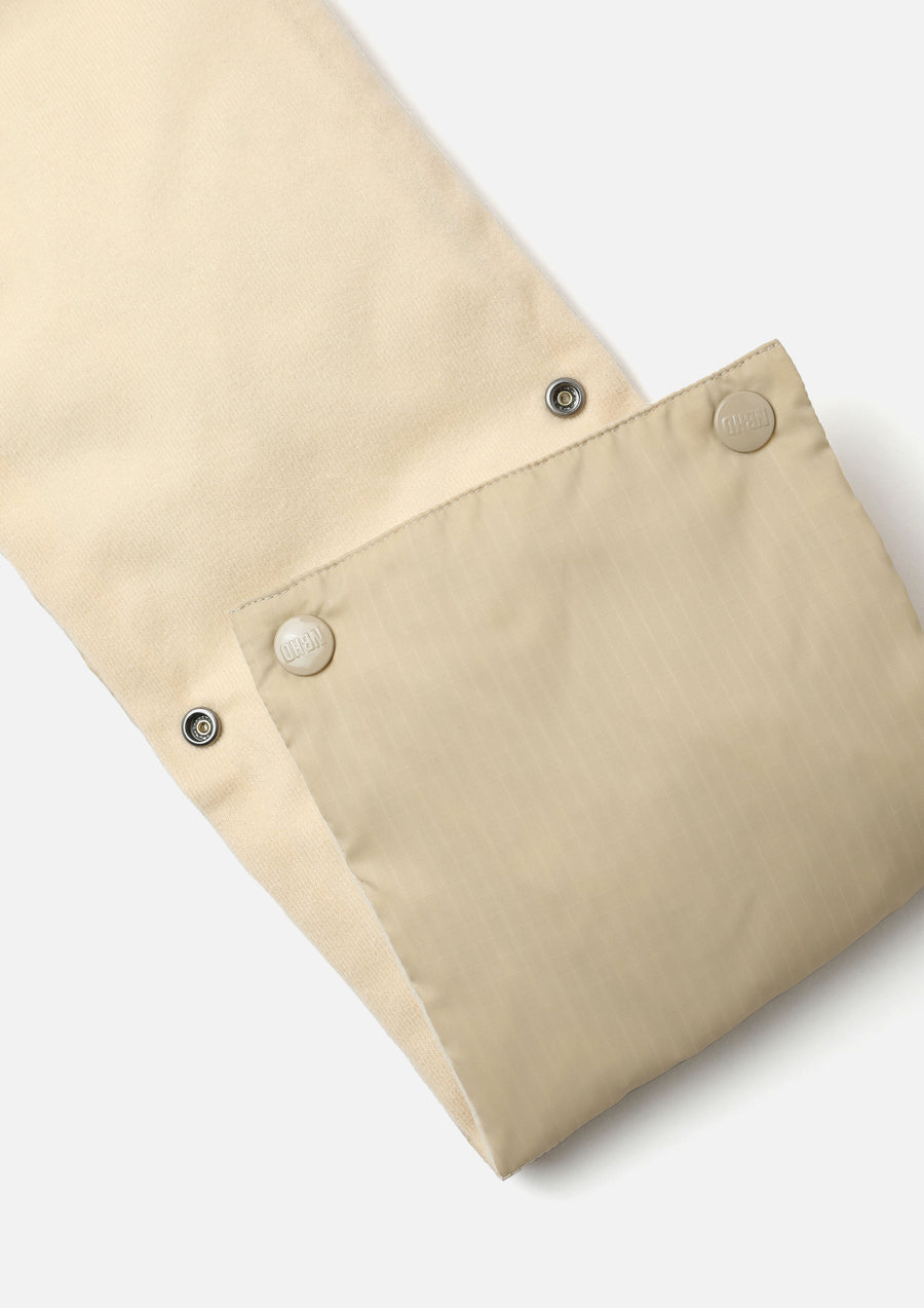 ハリとコシがあり、鈍い光沢を持つナイロンリップストップ生地を使用したダウンマフラー。先端にスナップボタンを配置し、片側を通して固定できる2WAY仕様。裏地には肌触りなめらかなマイクロトリコットを採用。コラボレーションネームとピスネームを付属。1920年創業のアメリカ・シアトル発アウトドアブランドEddie Bauerとのジョイントワークアイテム。