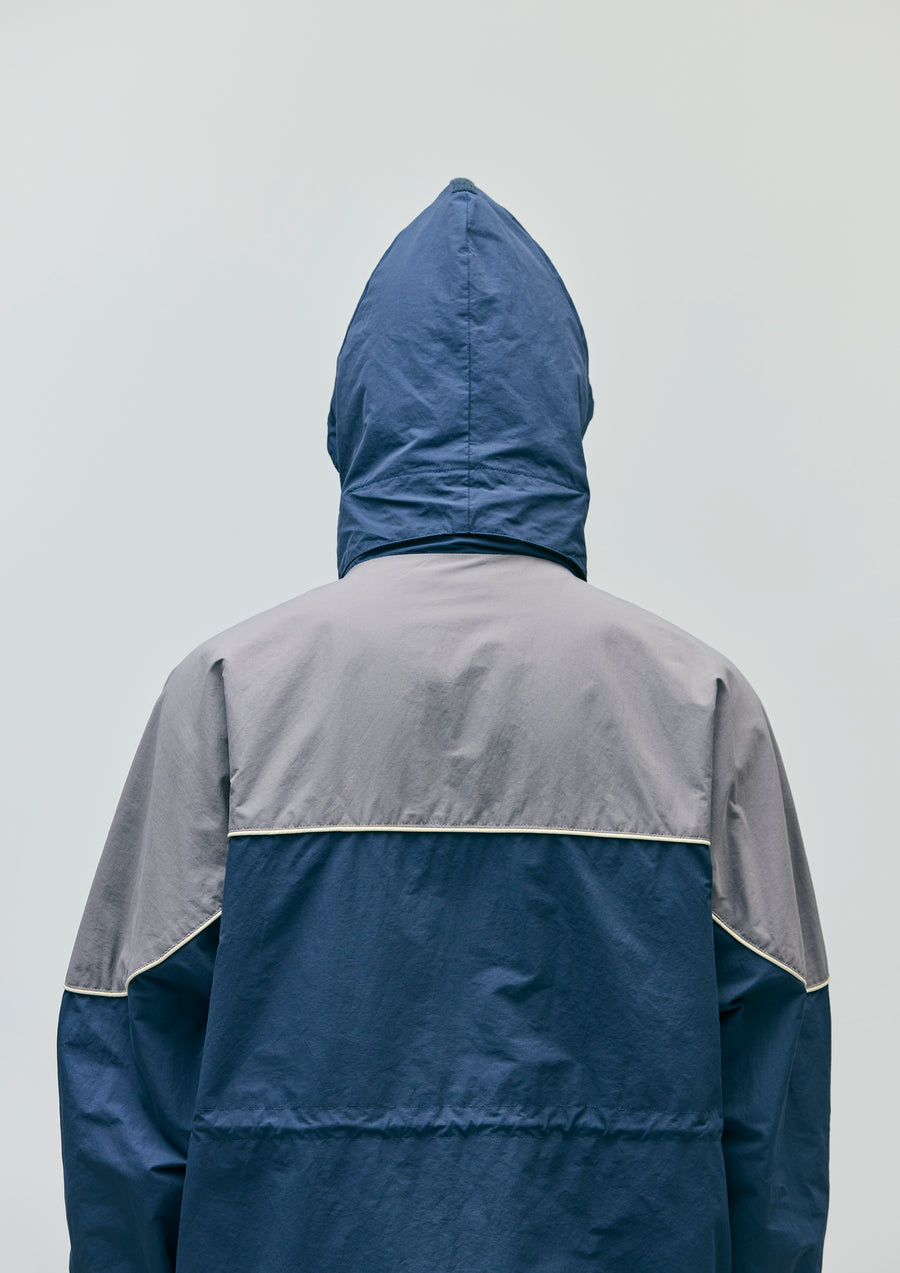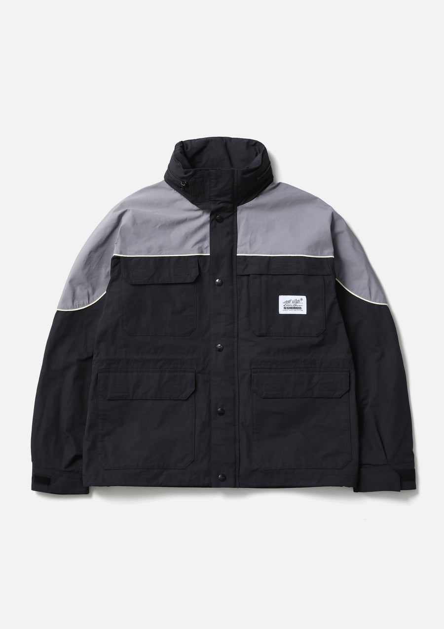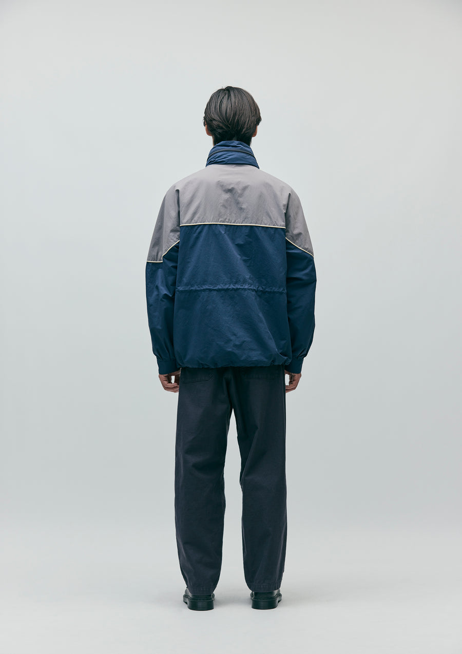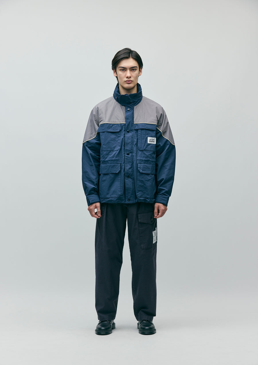 綿のような質感のコットンナイロンタフタ素材を配色で使用したスキージャケット。フロントに4つのユーティリティポケットを配置。フード収納型のスタンドカラー仕様。両裾に調節用のゴムスピンドルを内蔵。オリジナルスナップボタンを採用し、左胸にコラボレーションネーム、サイドシームにピスネームを付属。1920年創業のアメリカ・シアトル発アウトドアブランドEddie Bauerとのジョイントワークアイテム。
