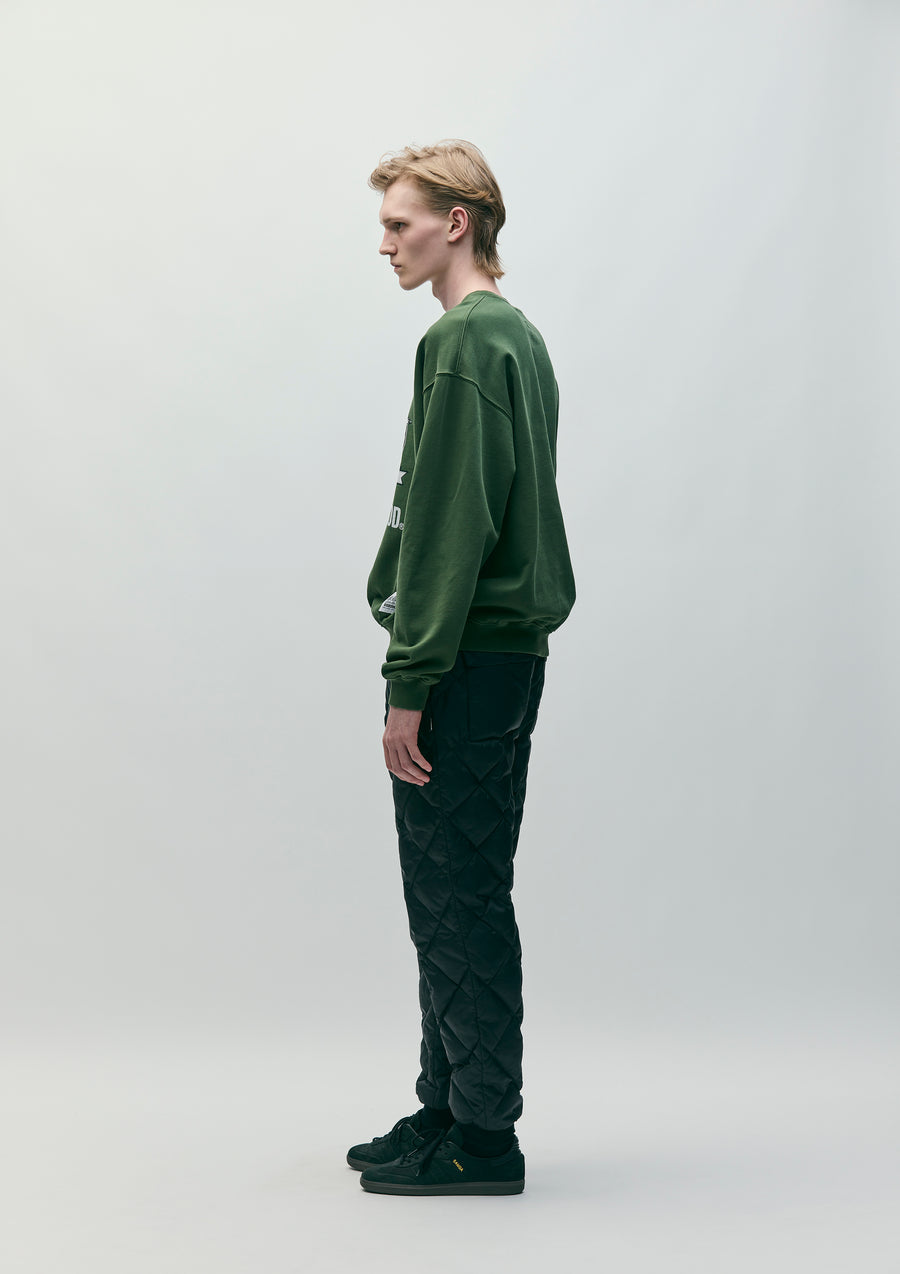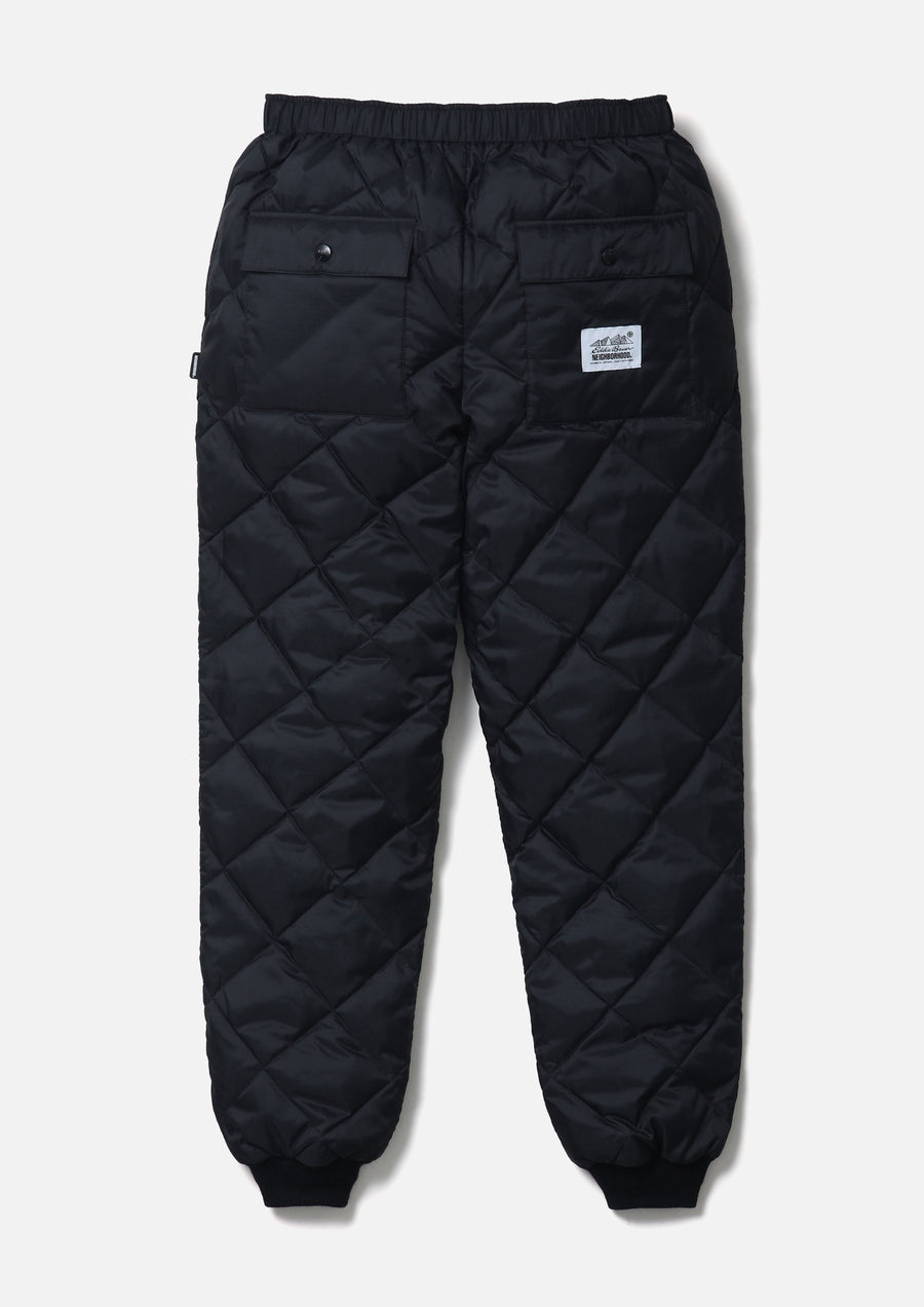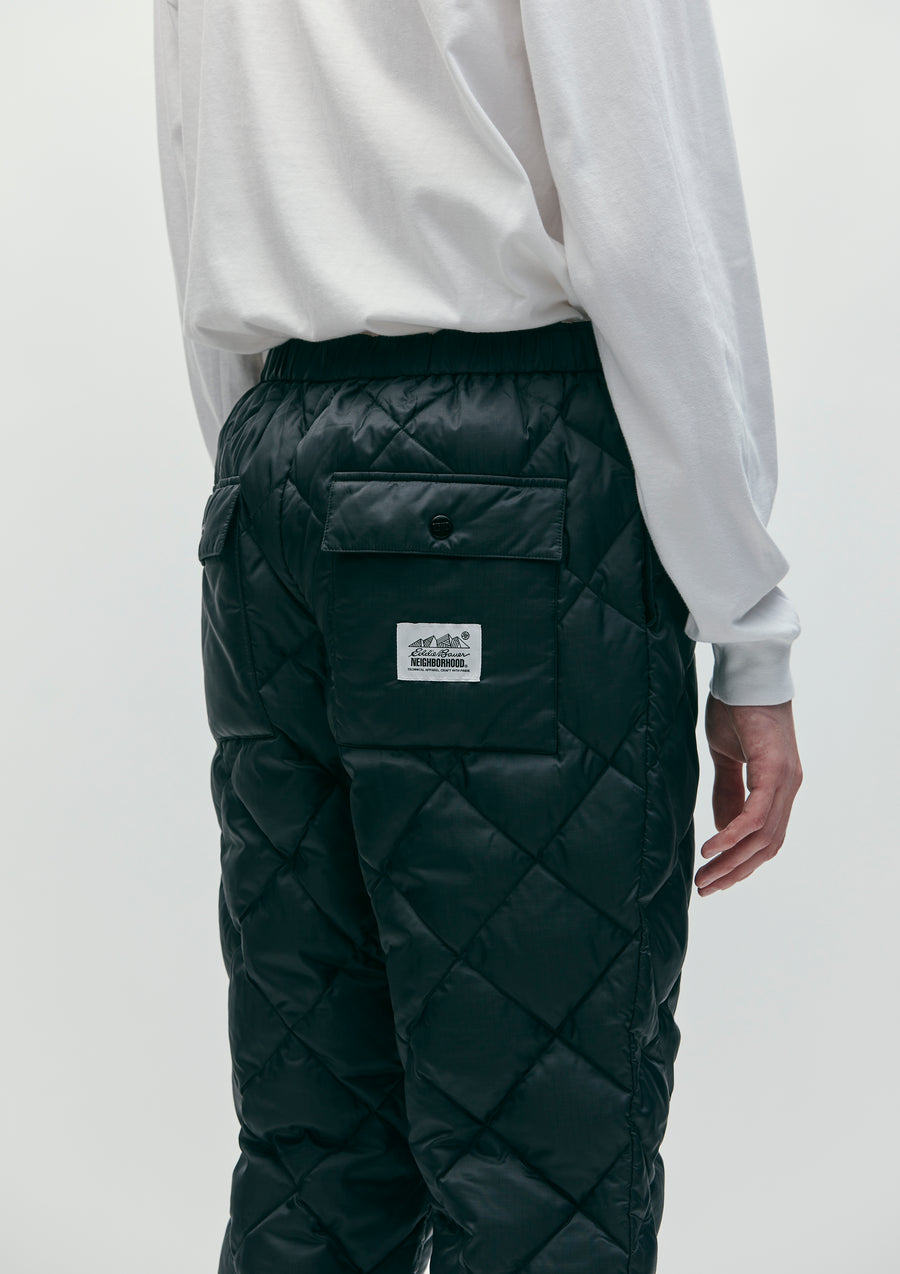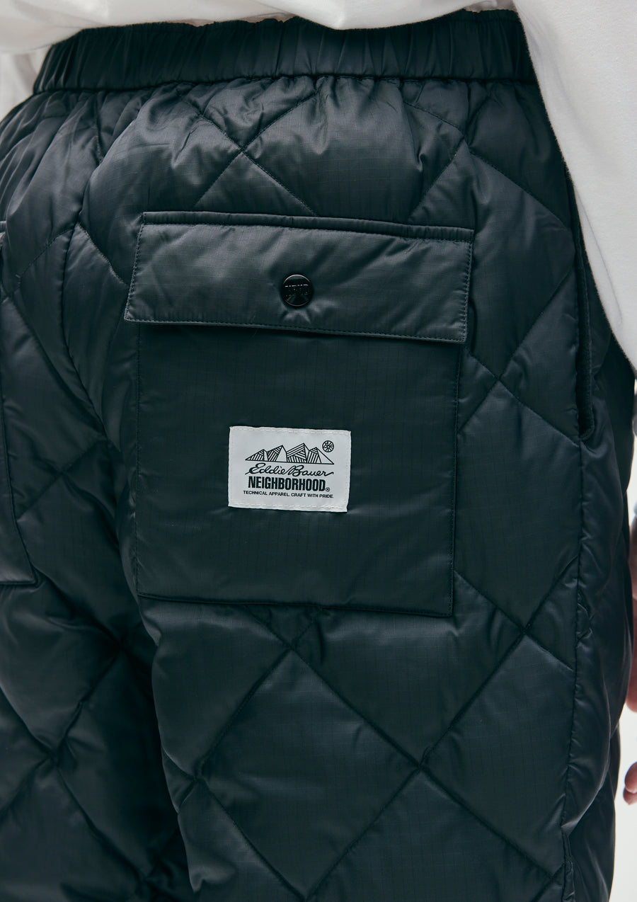 ハリとコシがあり、鈍い光沢を持つナイロンリップストップ生地を使用したダウンパンツ。両サイドに脇接ぎを利用したスラッシュポケット、背面にはボタン付きフラップポケットを配置。スナップボタン留めのゴム入りウエストに、調節可能なスピンドルを内蔵。裾はリブ仕様。コラボレーションネーム、サイドシームにピスネームを付属。1920年創業のアメリカ・シアトル発アウトドアブランドEddie Bauerとのジョイントワークアイテム。