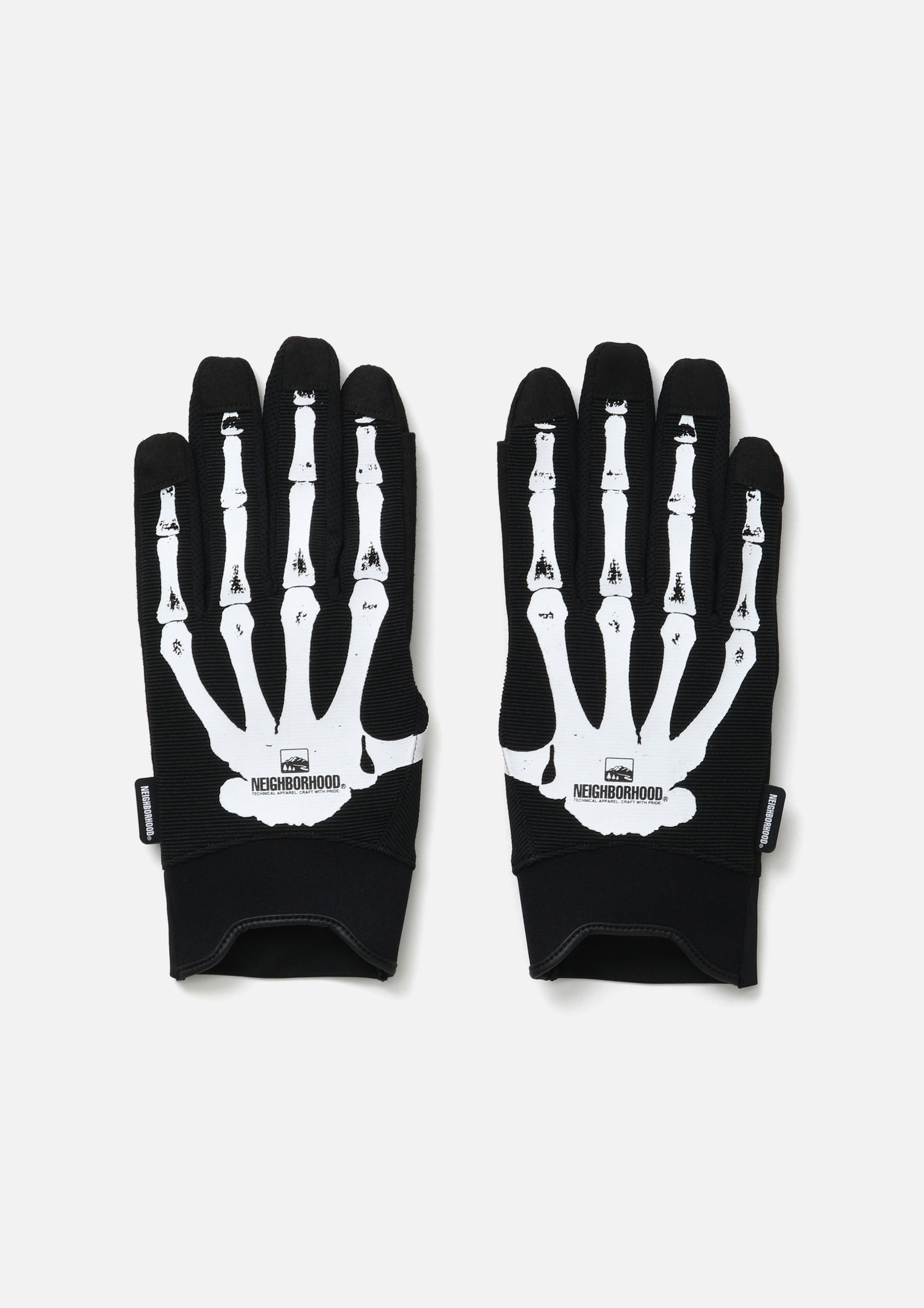 日差しや外的要因から手を保護するアクティブグローブ。スマートフォン操作時や細かい作業時、人差し指と親指部分を開閉できる仕様。手の甲にボーンモチーフのグラフィックをプリント。