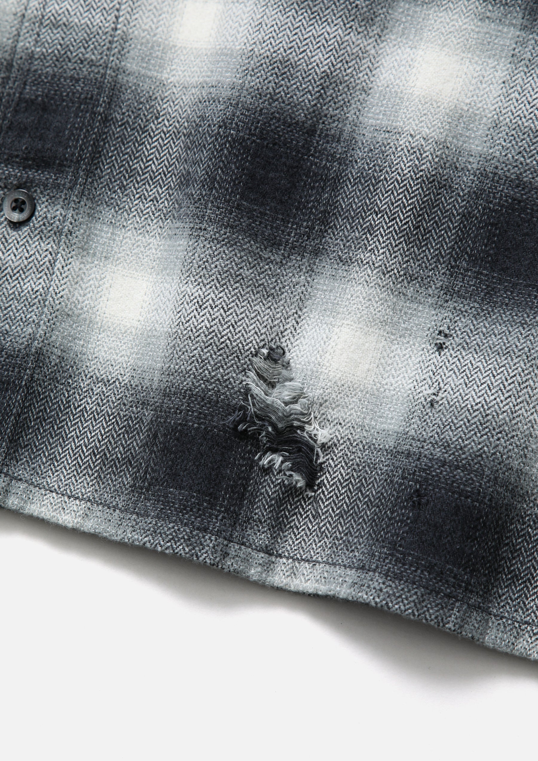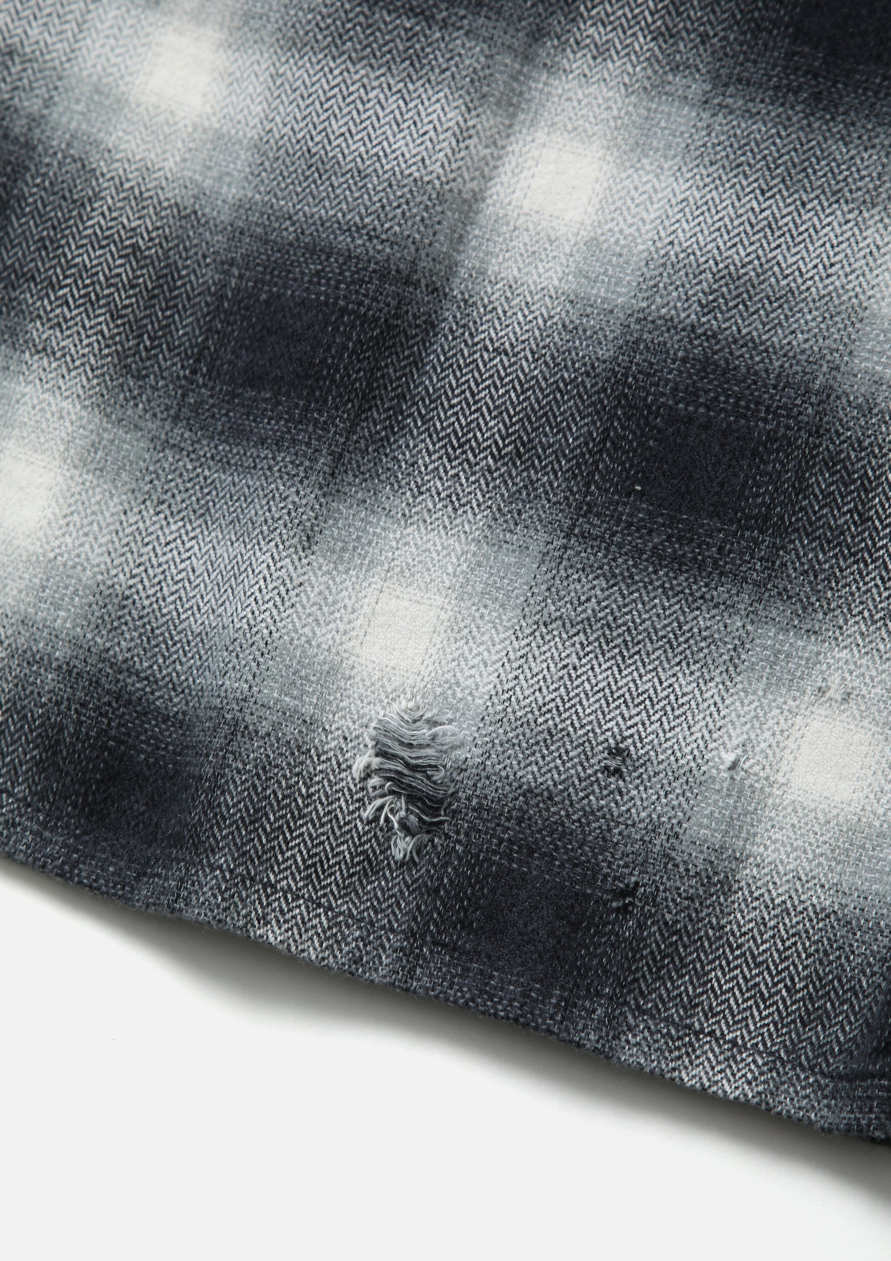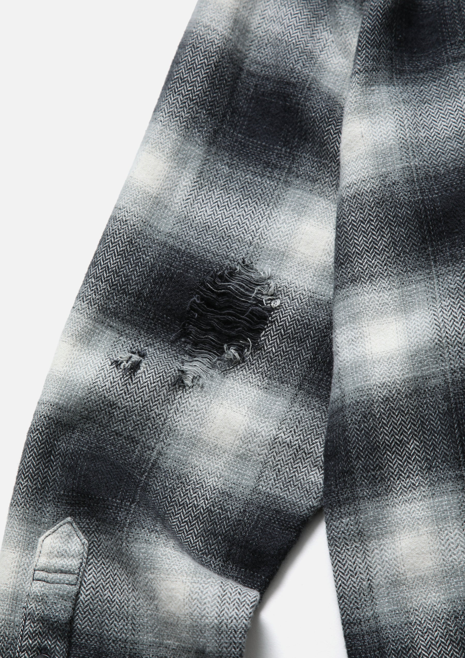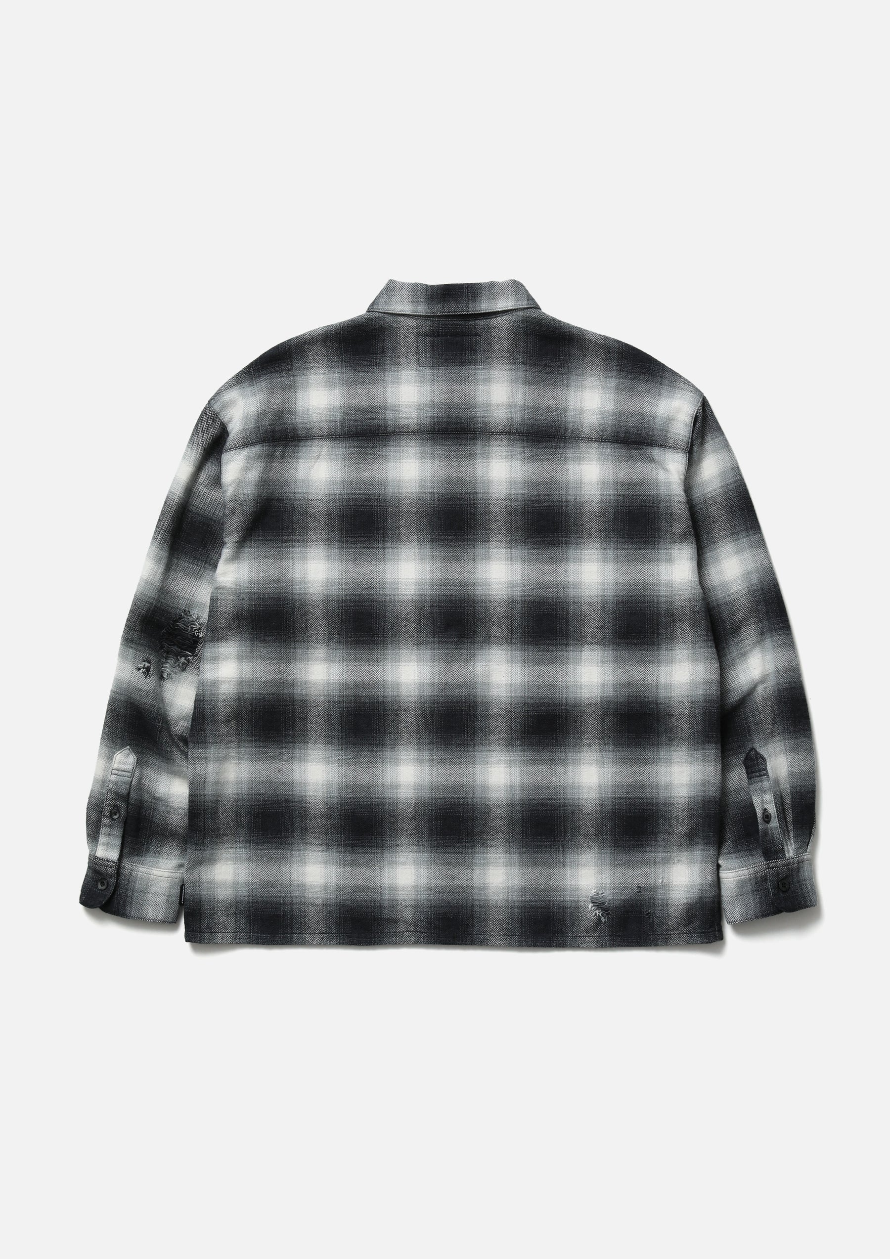 オンブレチェック生地をベースに、サベージ加工を施したロングスリーブシャツ。身頃や袖にダメージホールの加工を施し、リアルなエイジングを表現。両胸にパッチポケットを配置。オリジナルボタンを採用。脇接ぎにピスネームを付属。ワンウォッシュ仕上げ。Anthony GalleryオーナーEasy Otabor主宰の歴史的アーカイブを通じて過去と現在をつなぐブランドInfinite Archivesとのコラボレーション。