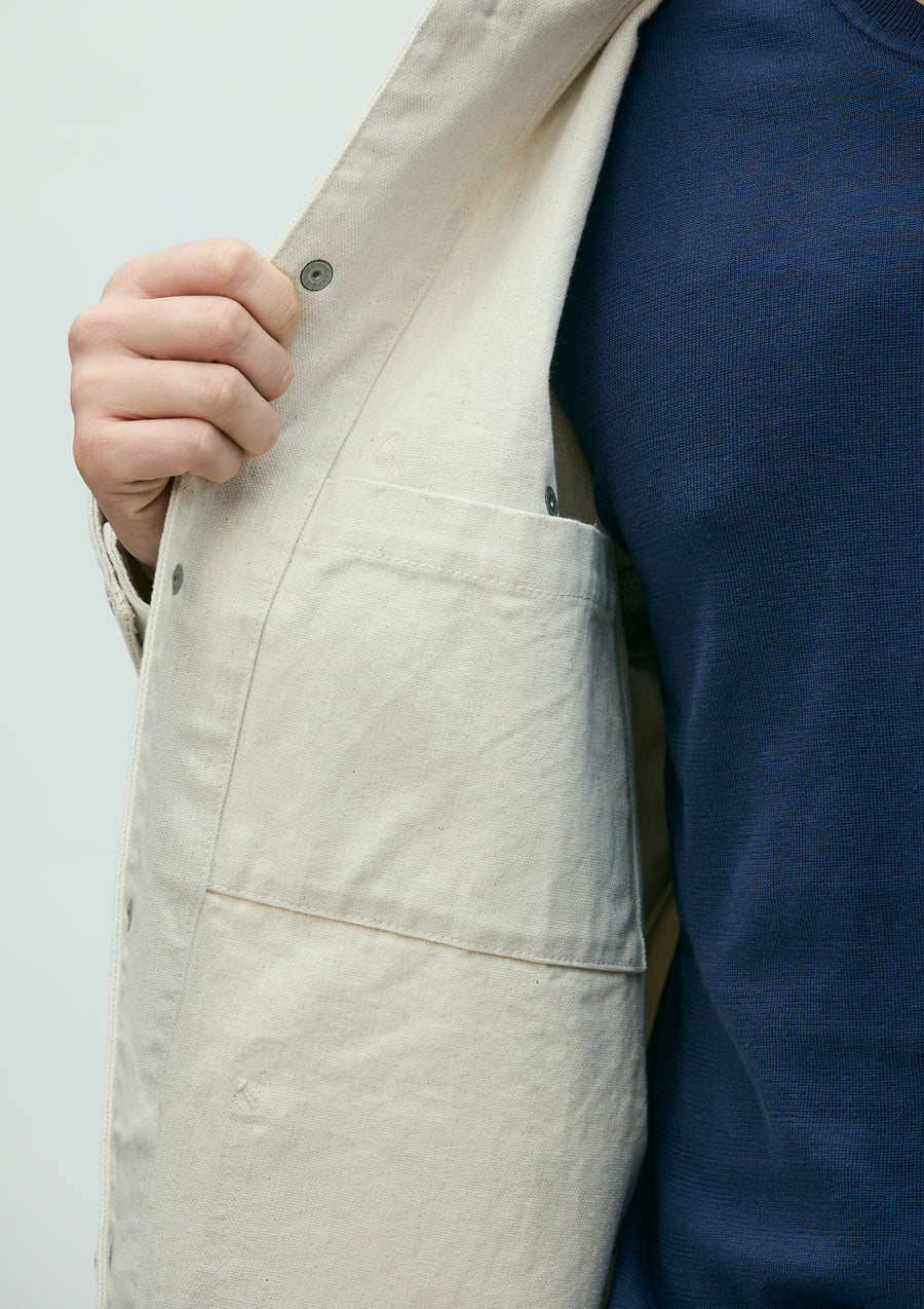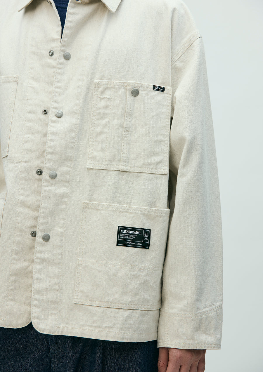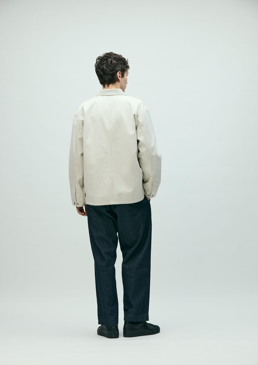 オックス生地の本体にコットンピケの襟を組み合わせたカバーオールジャケット。胸元にはペン差しホールとウォッチポケット、トリプルステッチの巻縫い仕様など、クラシックなディティールを踏襲。オリジナルのスナップボタンを採用し、トップボタンのみメタルボタン仕様。ポケットにブランドタグ、脇接ぎにピスネームを付属。ワンウォッシュ仕上げ。