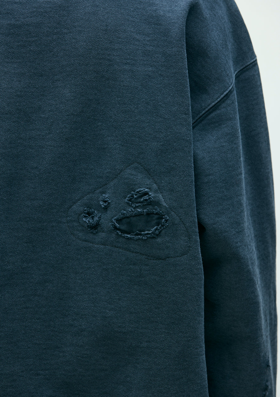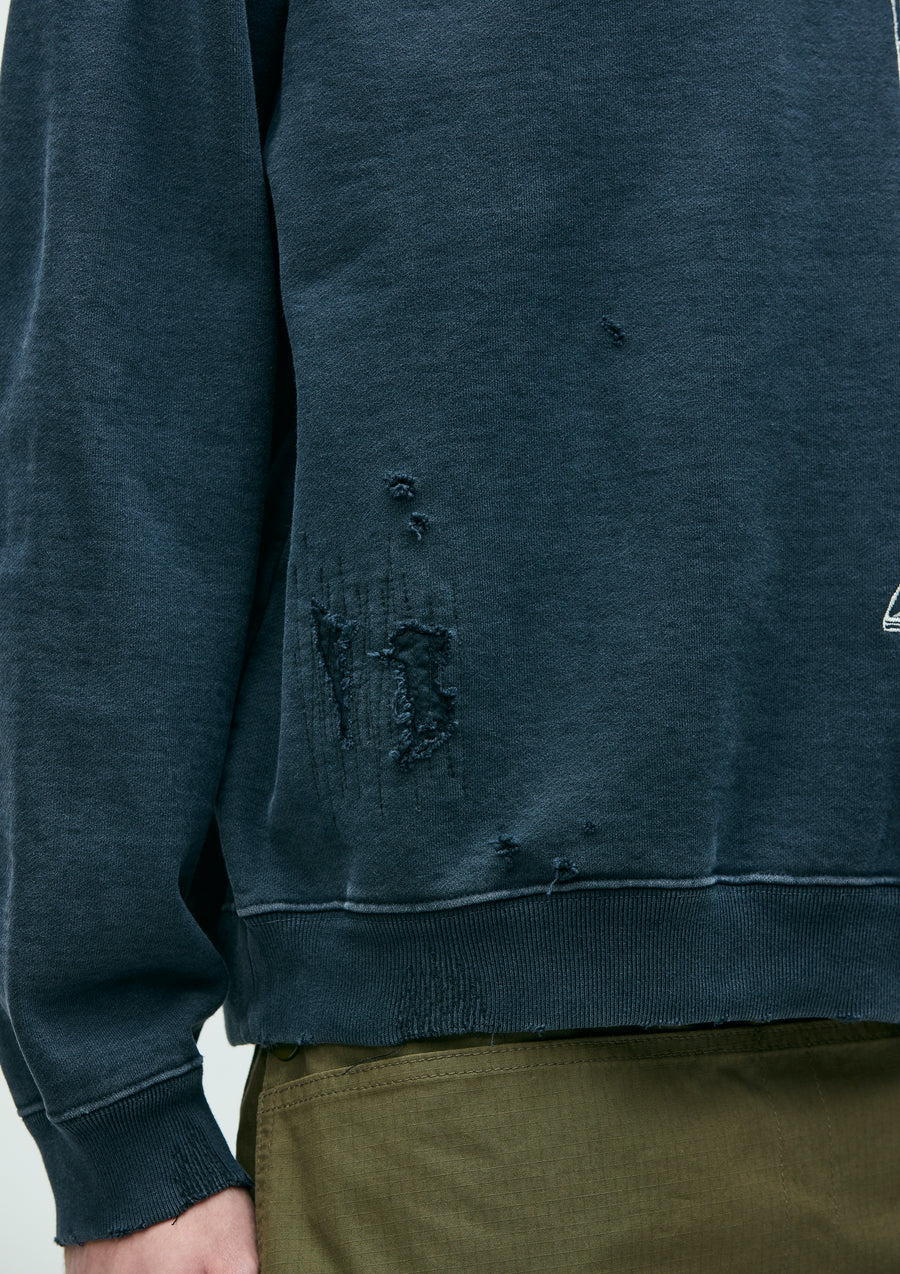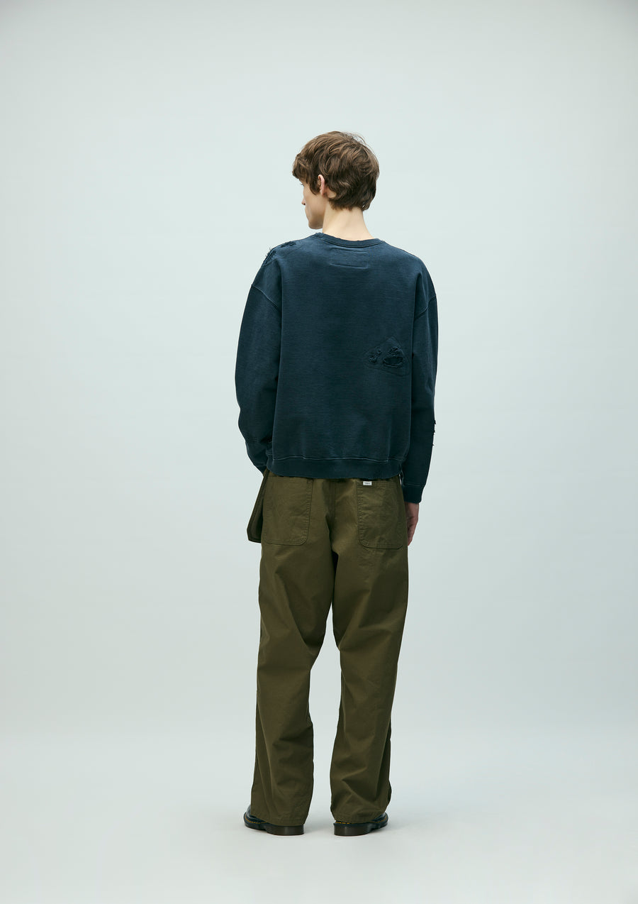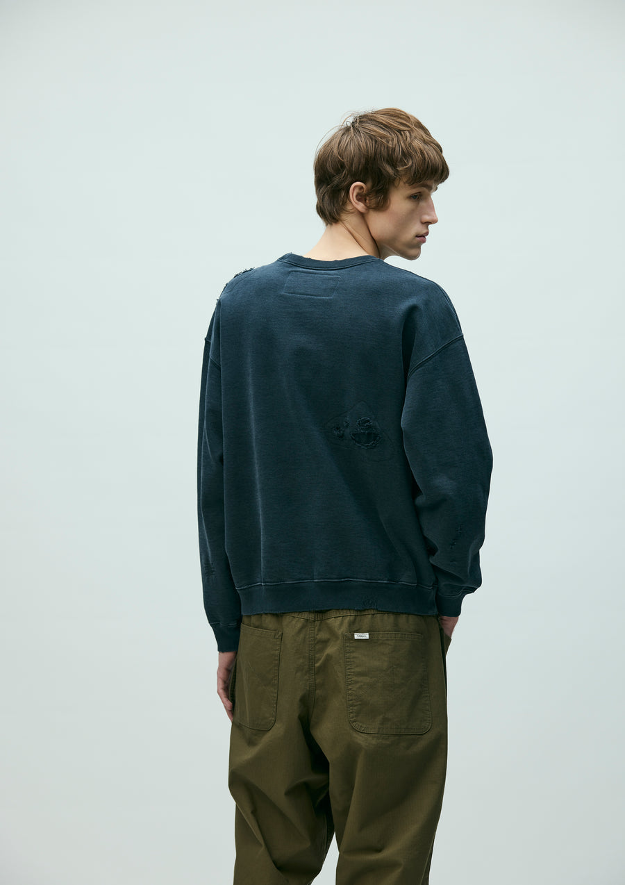 程よく厚みのあるコットン裏毛素材をベースにサベージ加工を施したクルーネックプルオーバー。洗い加工、リペア、色落ち、ダメージホールなどの複合加工を用いてリアルな経年変化を再現。ロゴプリント上にインセンスチャンバーモチーフの刺繍を配置。左裾にカスタムクラフテッドアイテム専用ブランドタグ、脇接ぎにピスネームを付属。