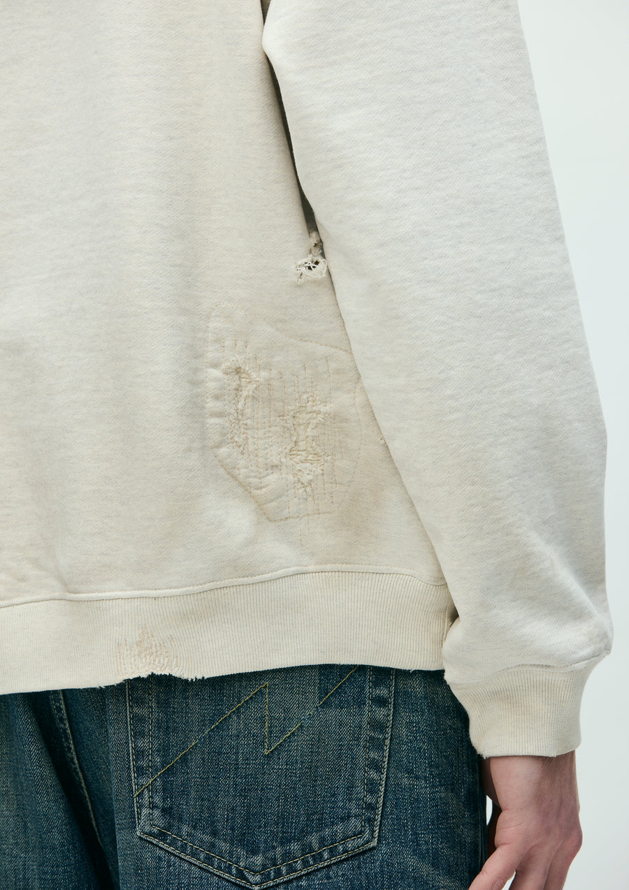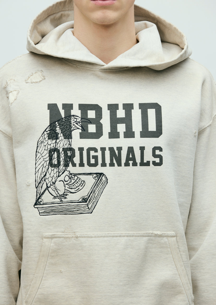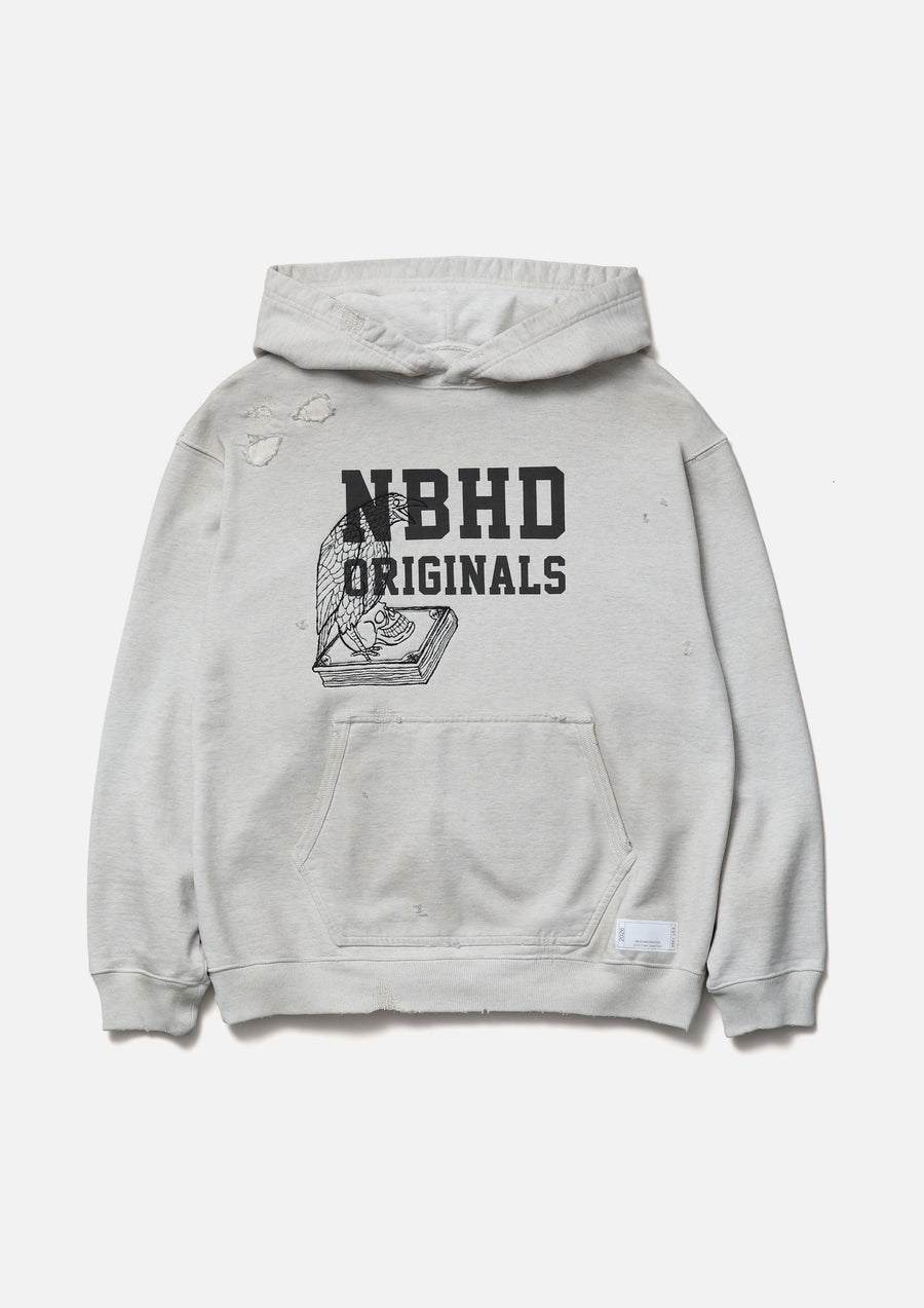 程よく厚みのあるコットン裏毛素材をベースにサベージ加工を施したプルオーバーフーディ。洗い加工、リペア、色落ち、ダメージホールなどの複合加工を用いてリアルな経年変化を再現。ロゴプリント上にインセンスチャンバーモチーフの刺繍を配置。左裾にカスタムクラフテッドアイテム専用ブランドタグ、脇接ぎにピスネームを付属。