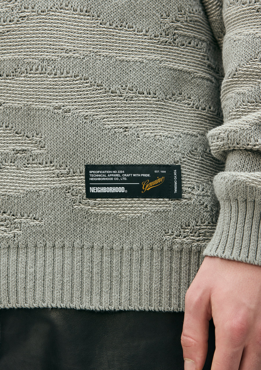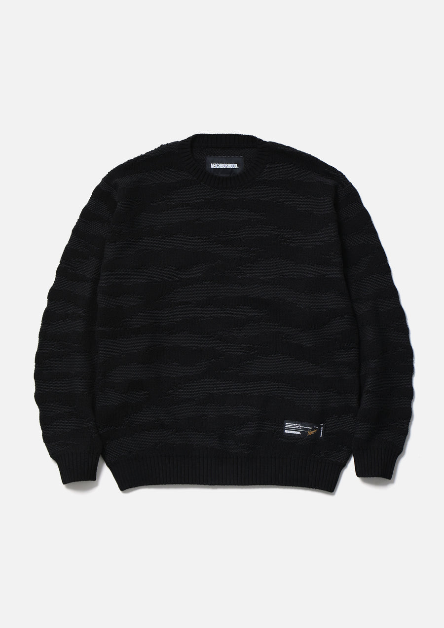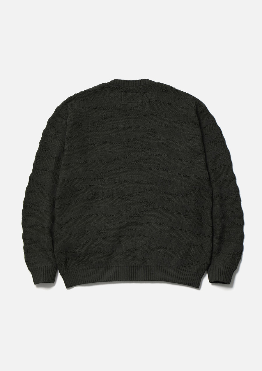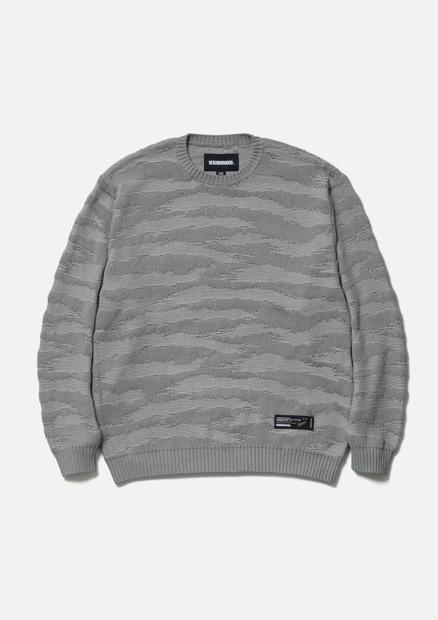 コットン糸で編み立てたタイガーカモ柄のクルーネックニット。タイガーカモ柄はダブルジャカードで表現。左裾にブランドタグを配置。