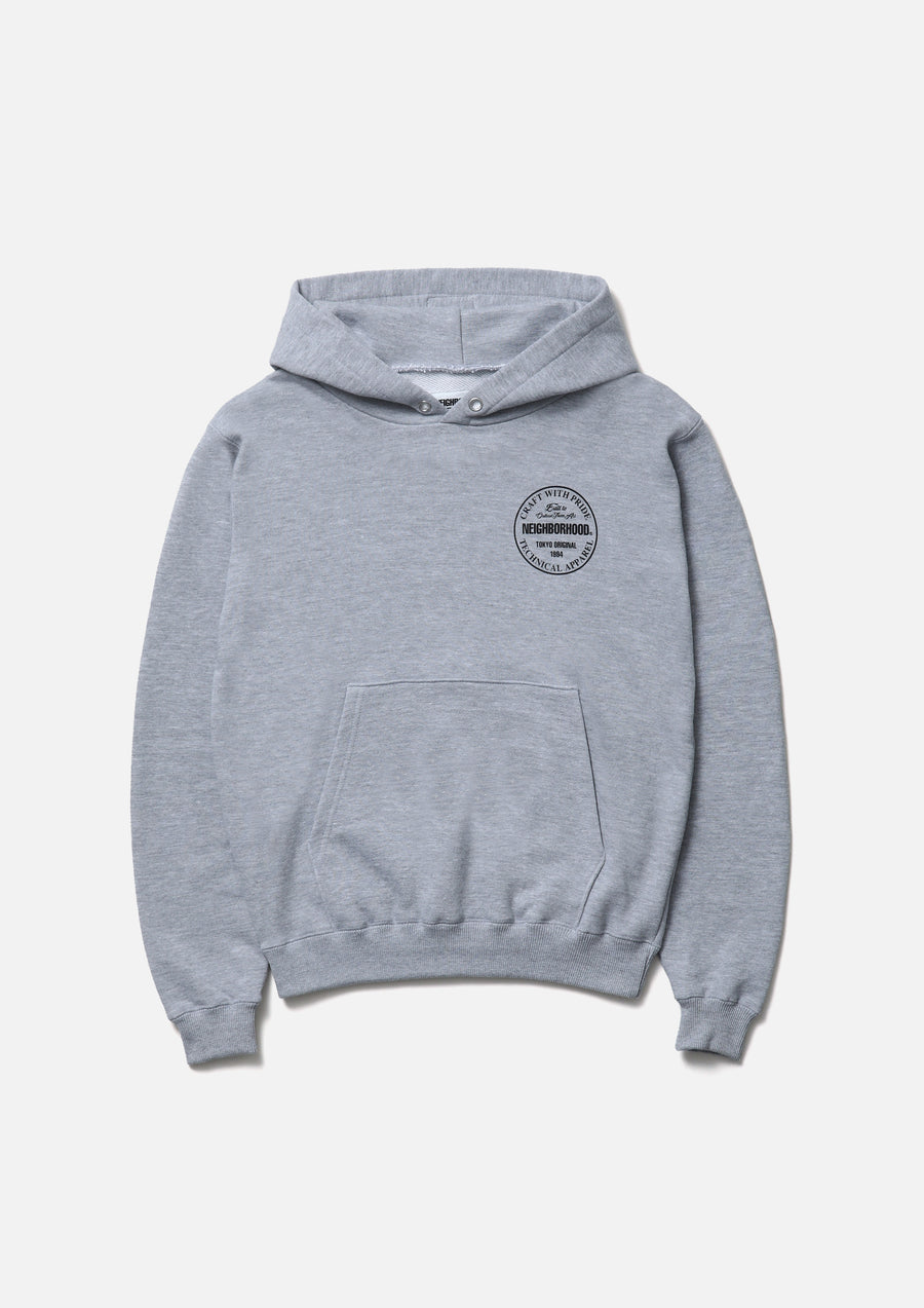 中肉のコットン裏毛素材使用したプルオーバーフーディ。左胸と背面にロゴをプリント。フードにブランドタグを配置。