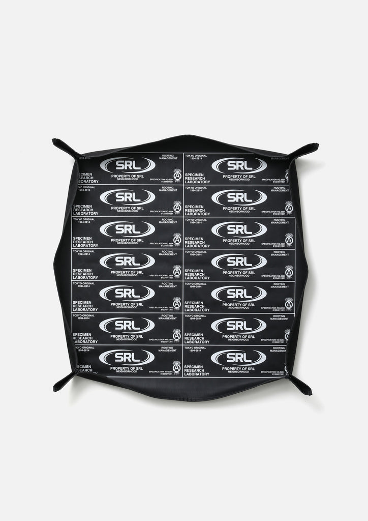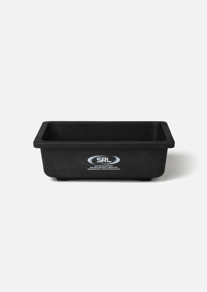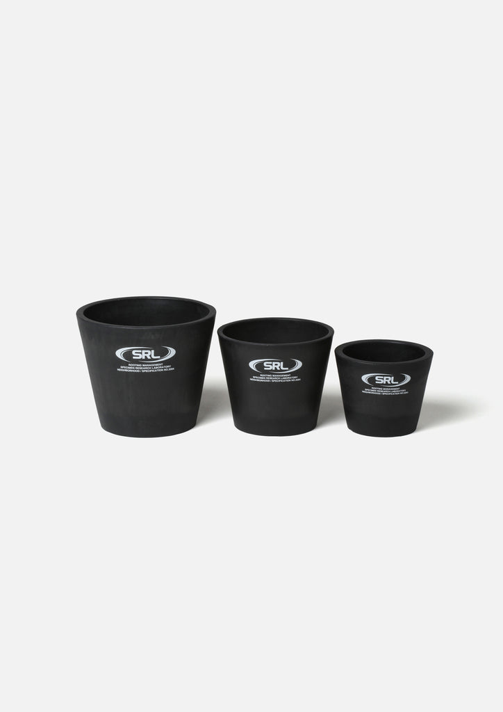SRLロゴをプリントしたプラスチック製プラントポット。テーパード型Mサイズ。立体ロゴを施したオリジナル型の底部分には水抜き用の穴を配置。