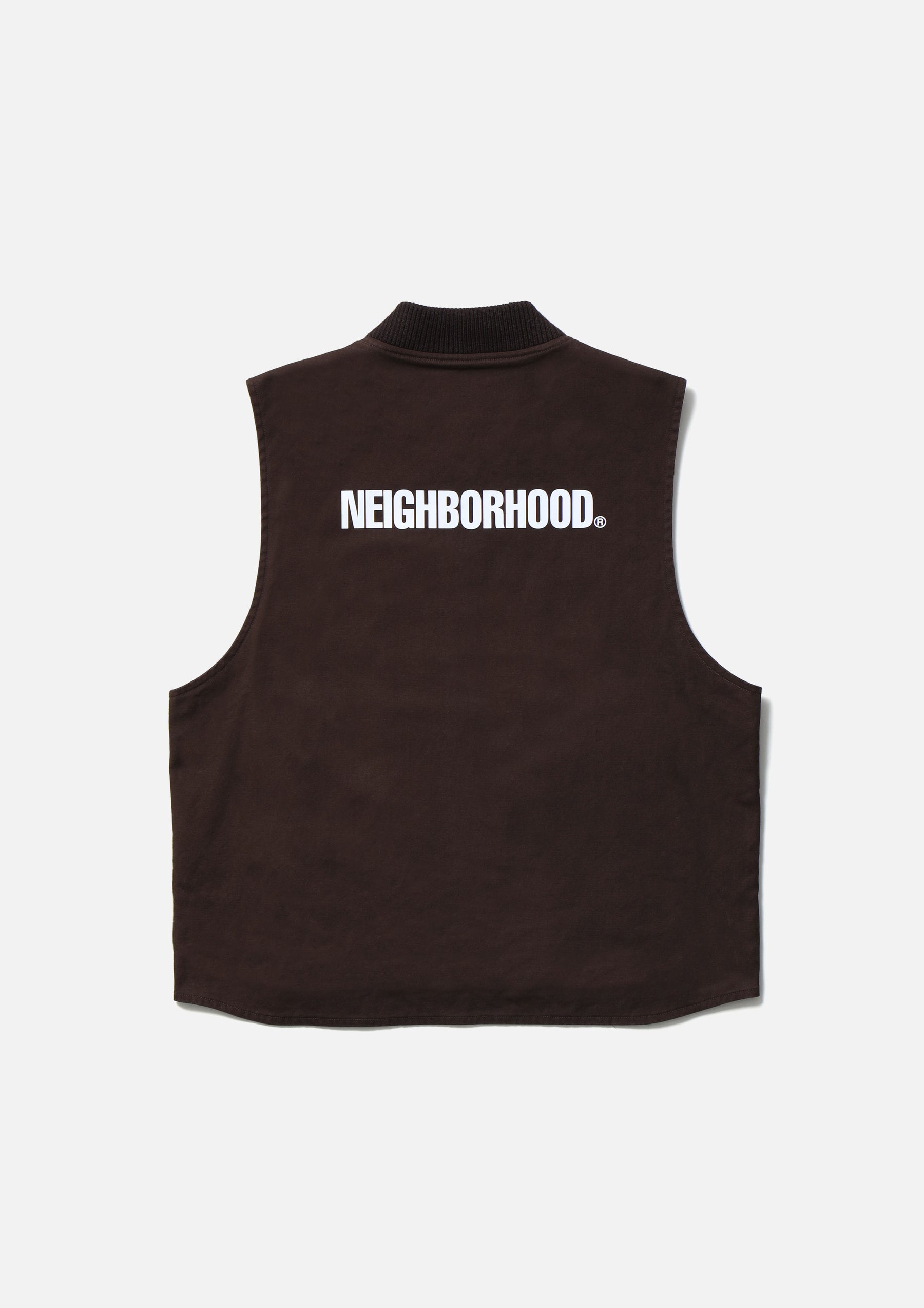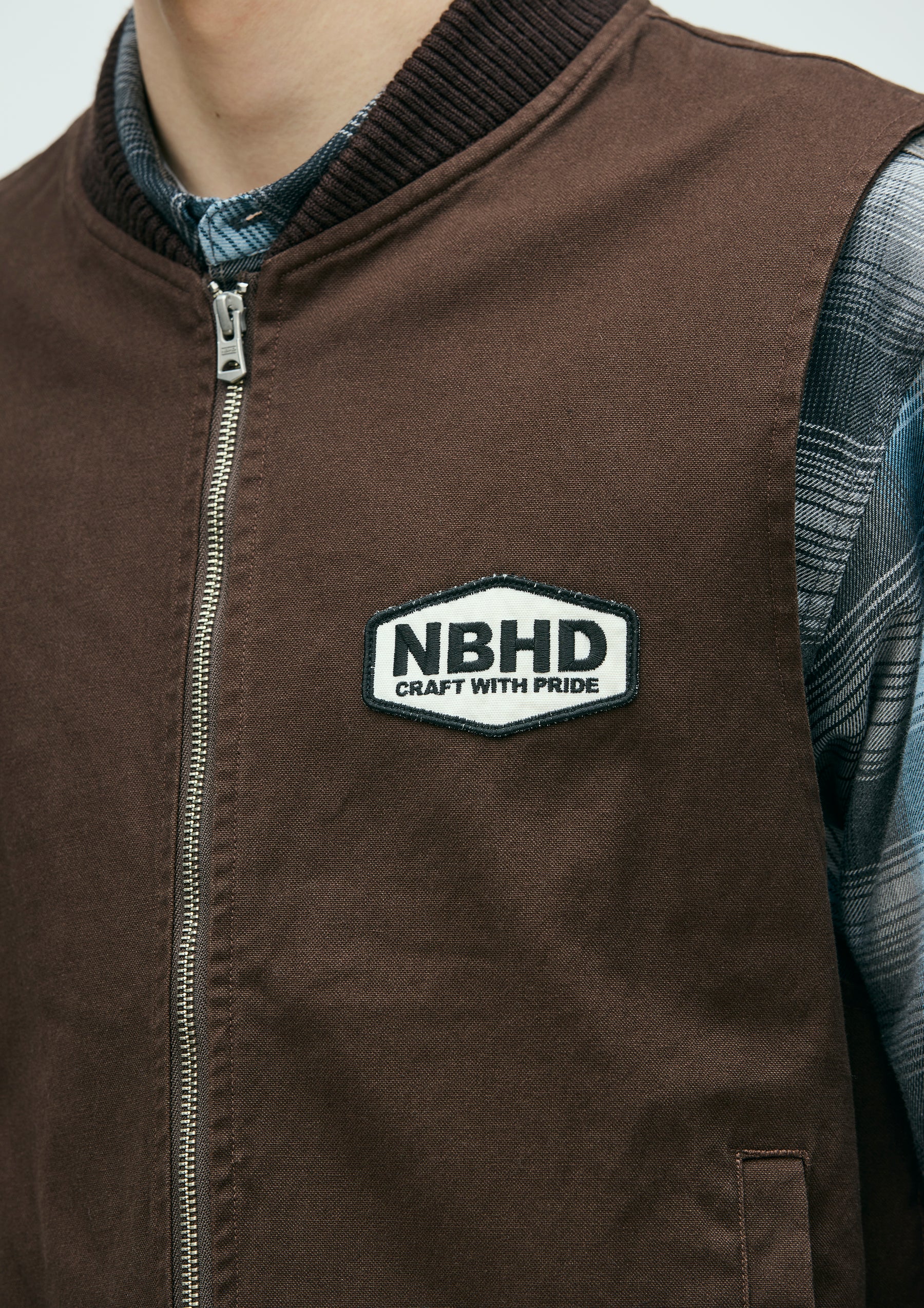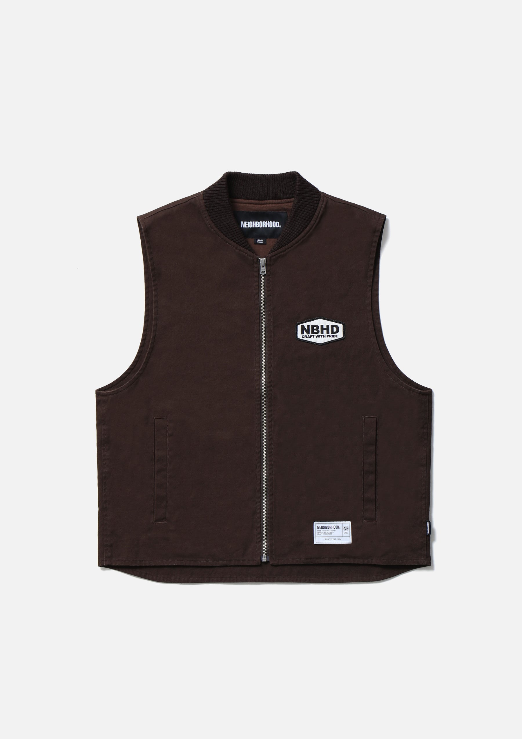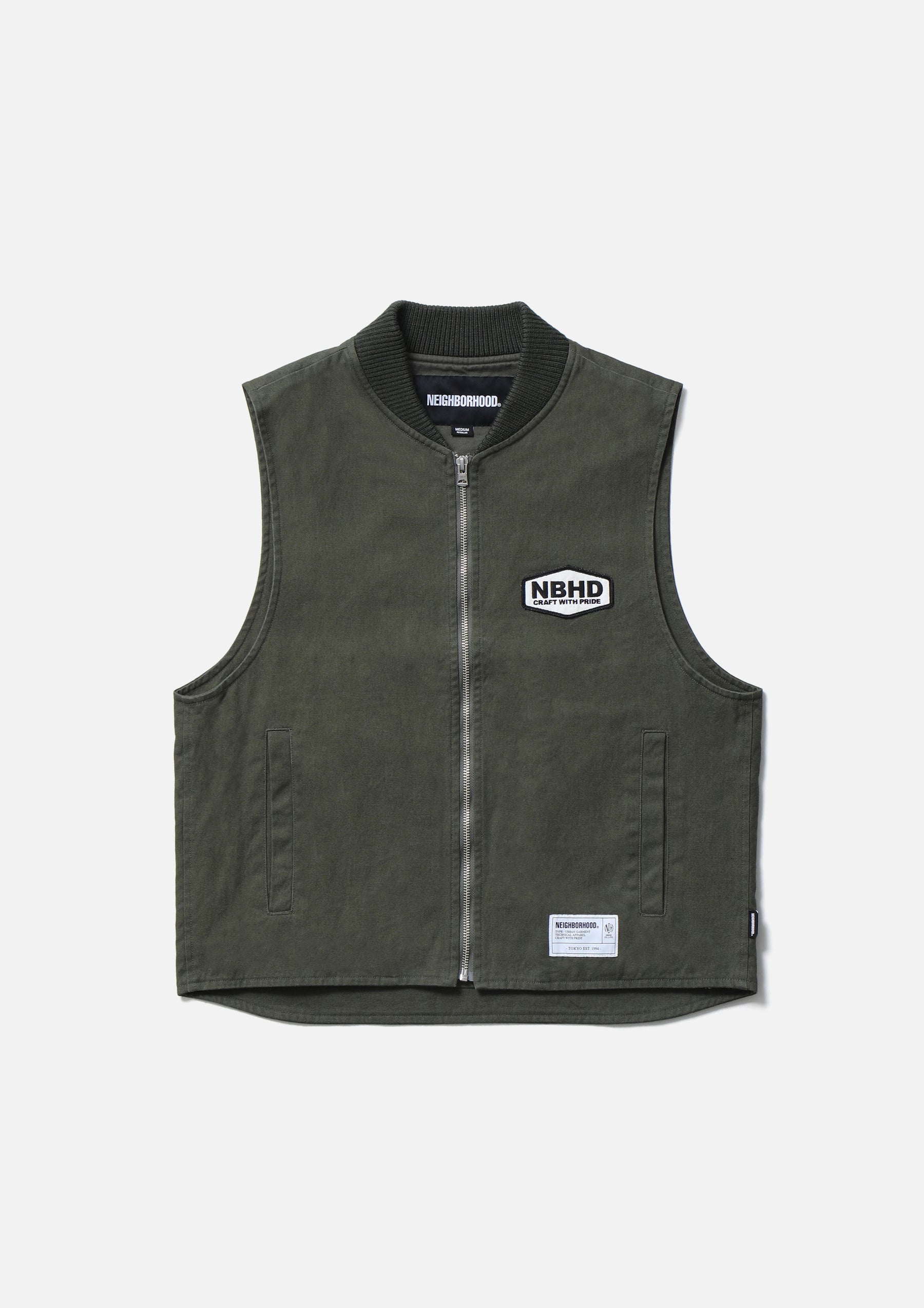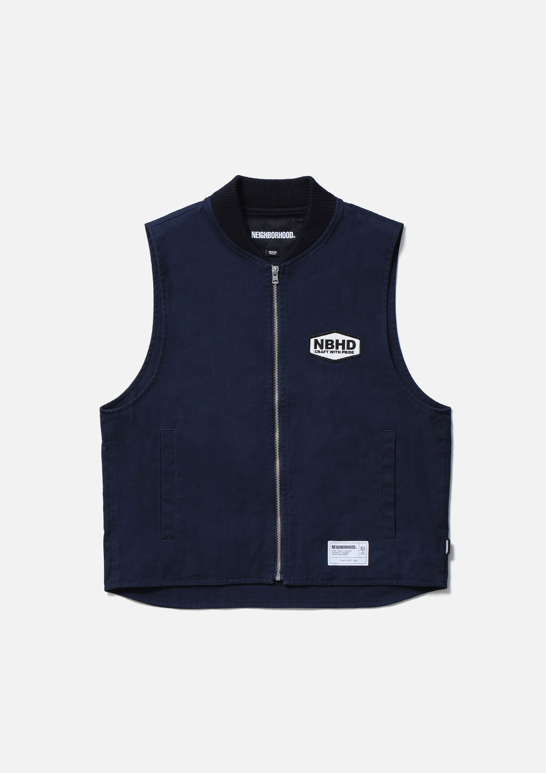 耐久性のある厚手ながら扱いやすい11号帆布生地を使用したジップワークベスト。リブ襟、薄手のツイル裏地仕様。左胸に刺繍ワッペンを施し、背面にロゴをプリント。オリジナルのジッパープルを採用。左裾にブランドタグ、脇接ぎにピスネームを付属。ワンウォッシュ仕上げ。