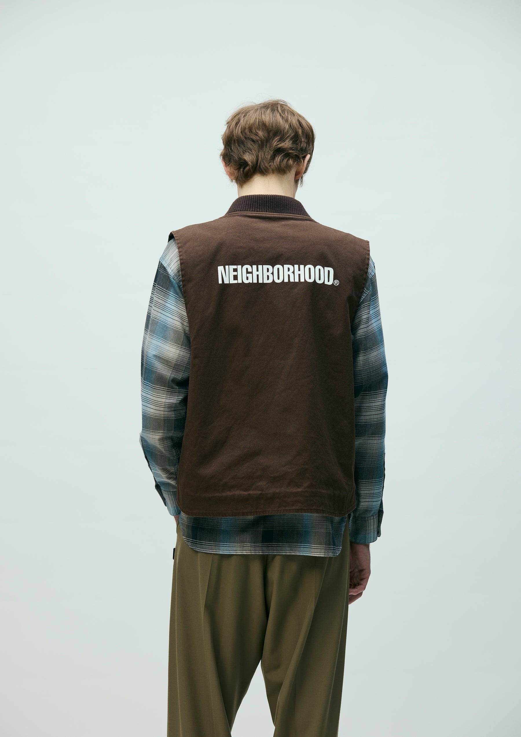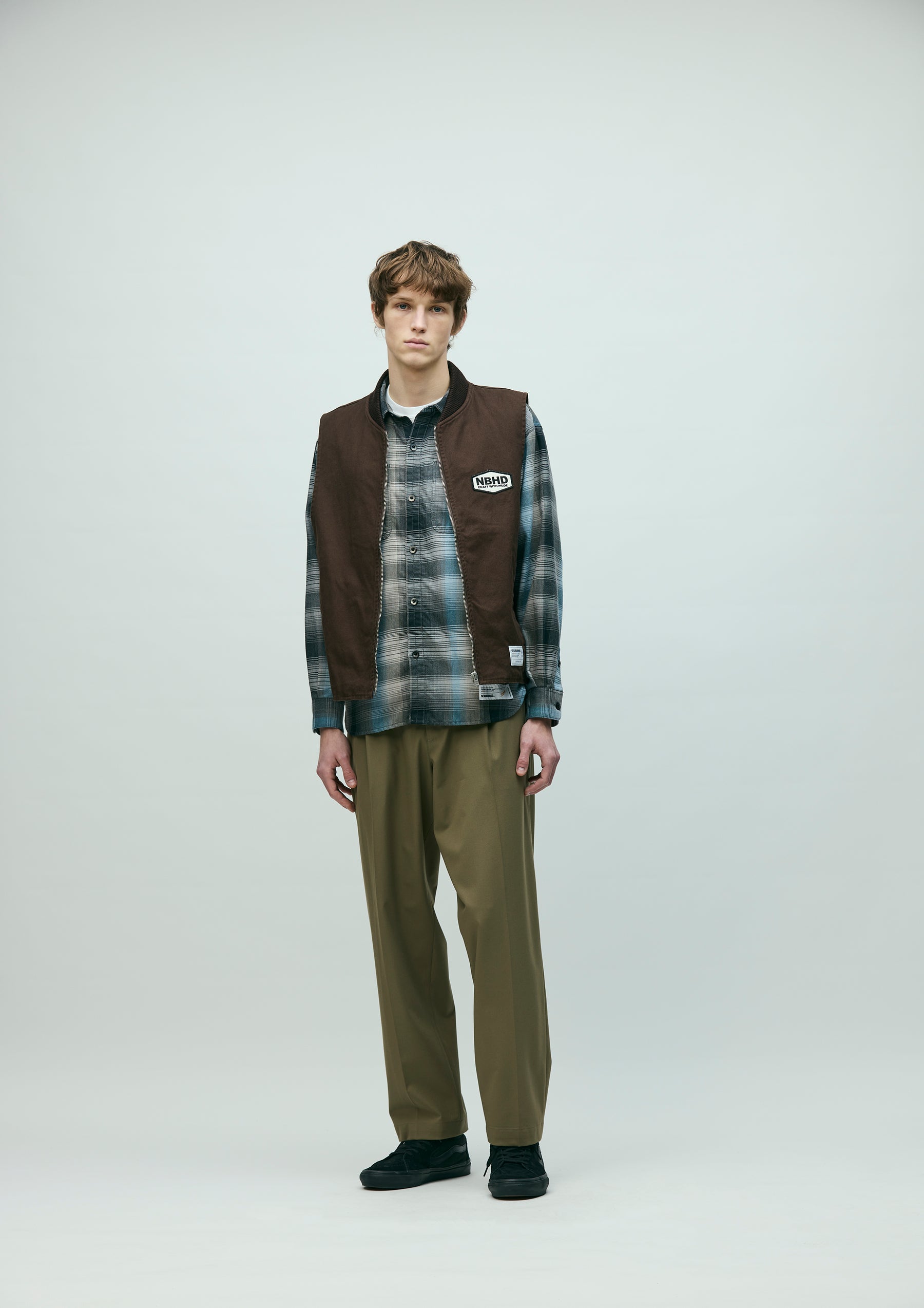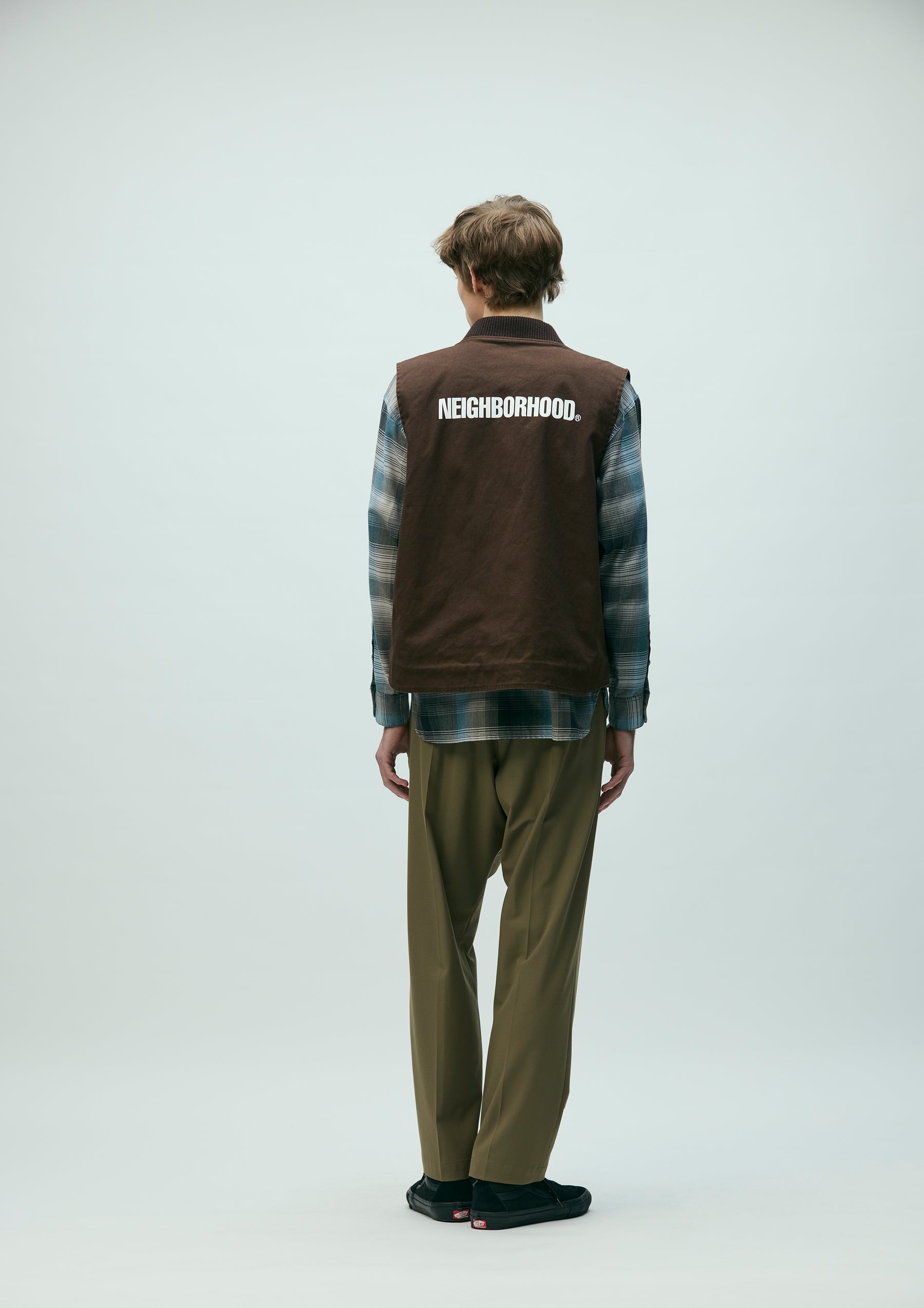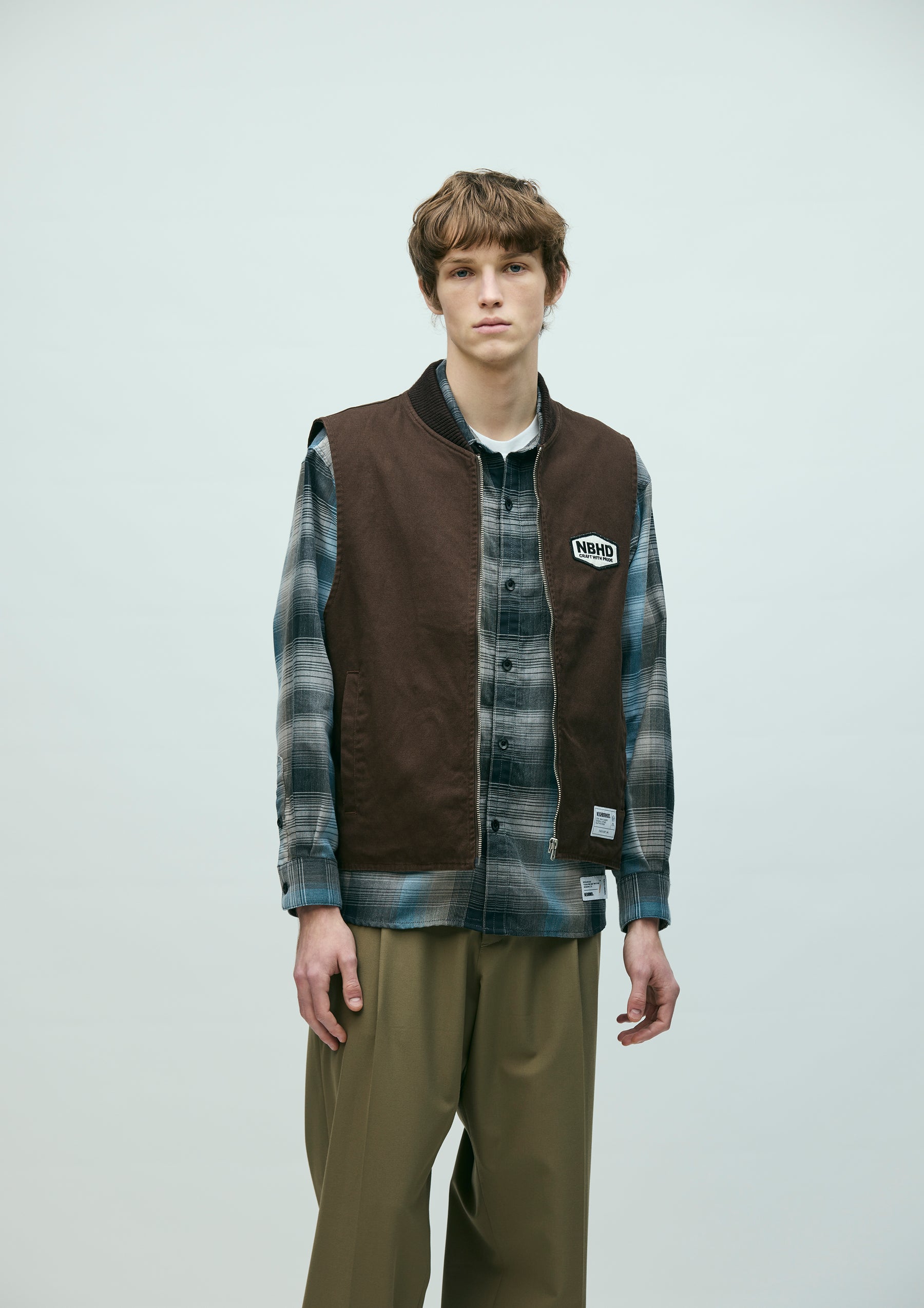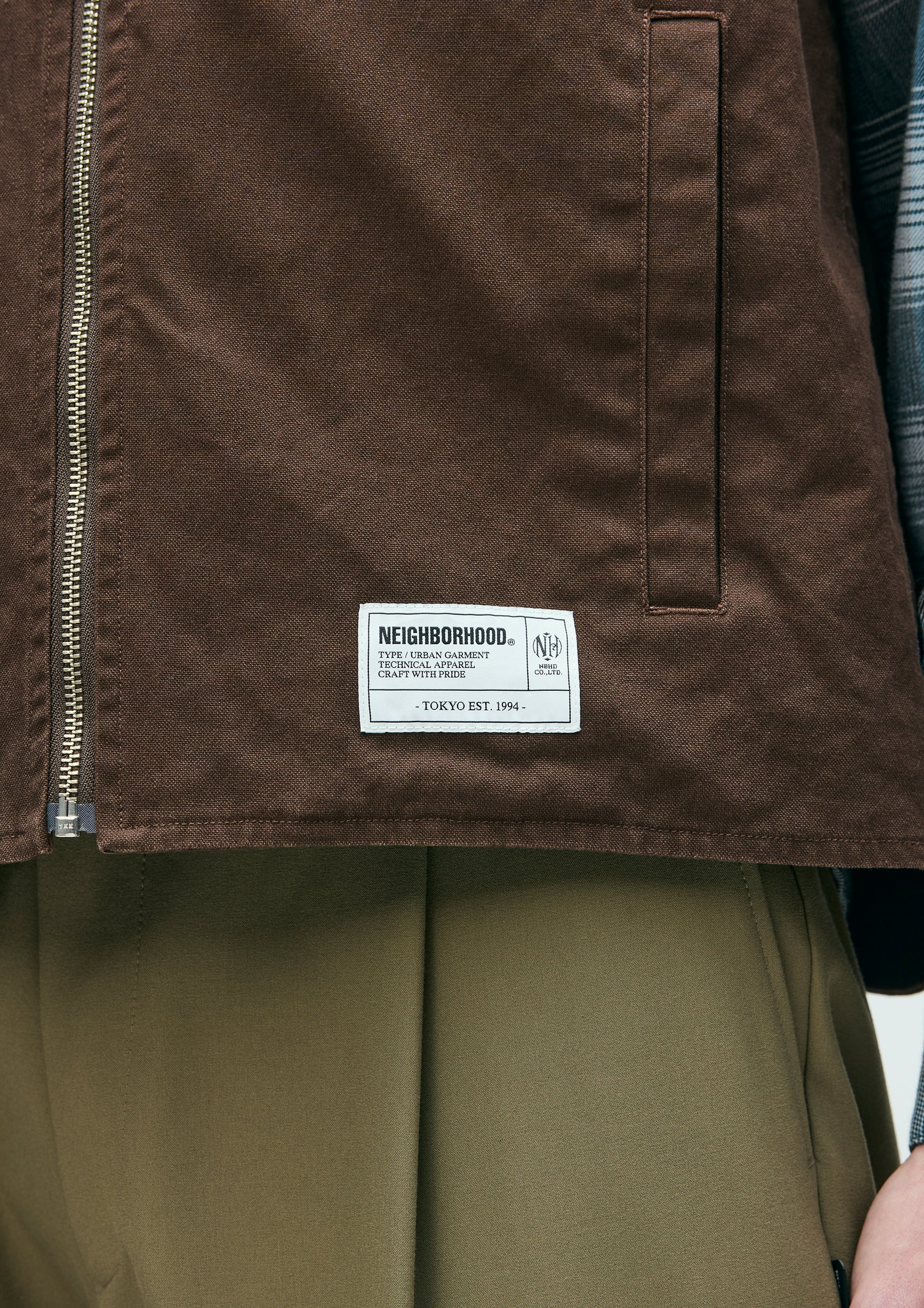 耐久性のある厚手ながら扱いやすい11号帆布生地を使用したジップワークベスト。リブ襟、薄手のツイル裏地仕様。左胸に刺繍ワッペンを施し、背面にロゴをプリント。オリジナルのジッパープルを採用。左裾にブランドタグ、脇接ぎにピスネームを付属。ワンウォッシュ仕上げ。