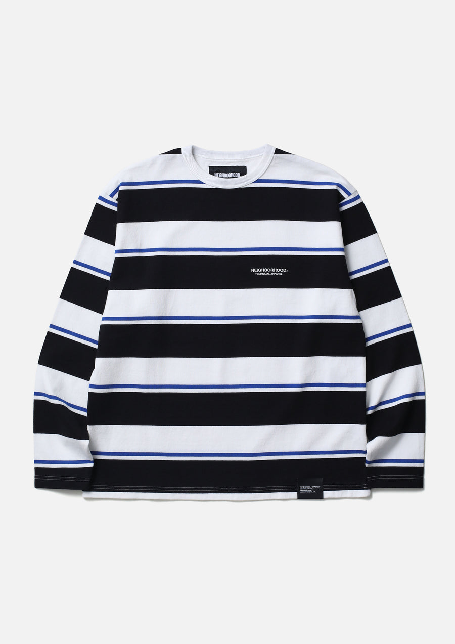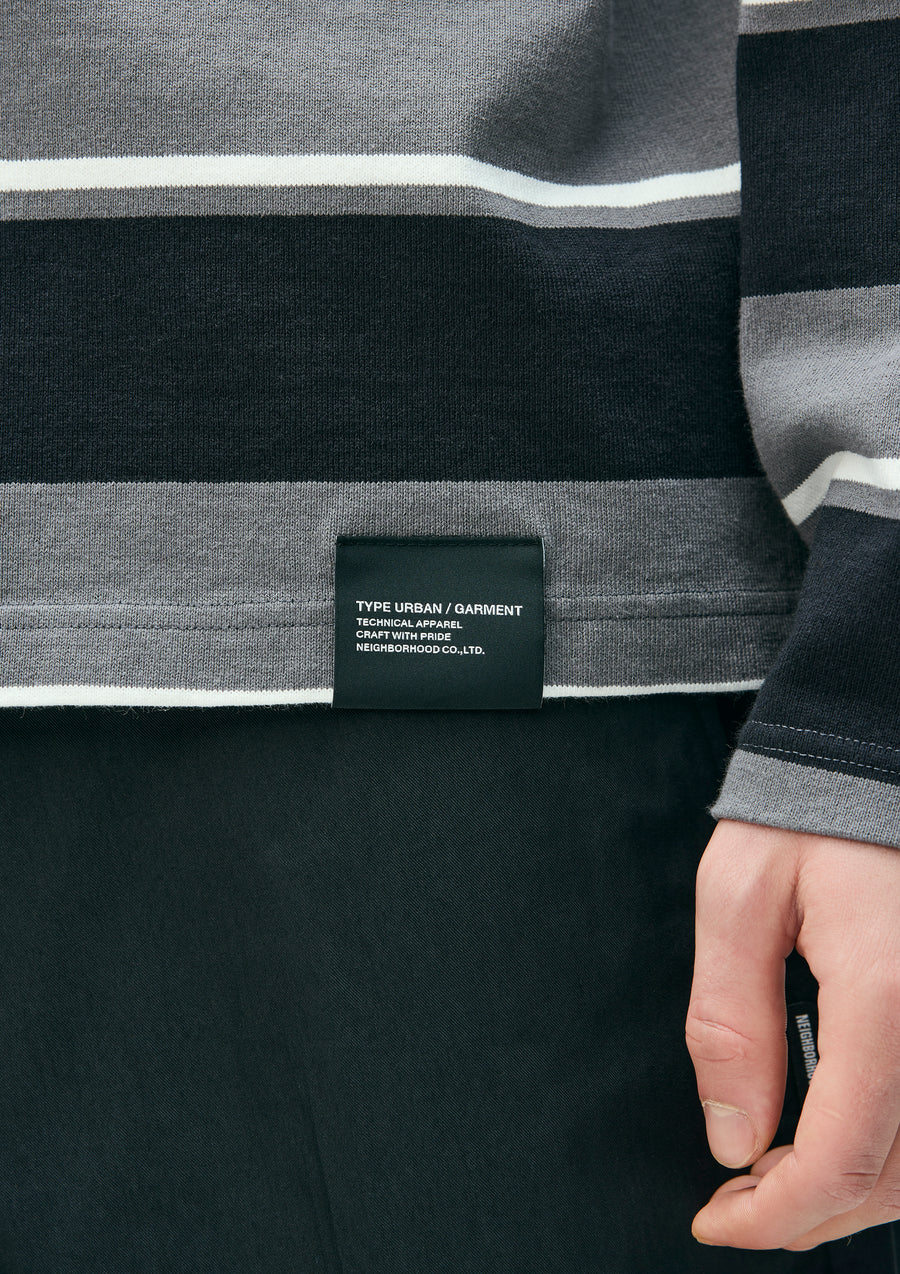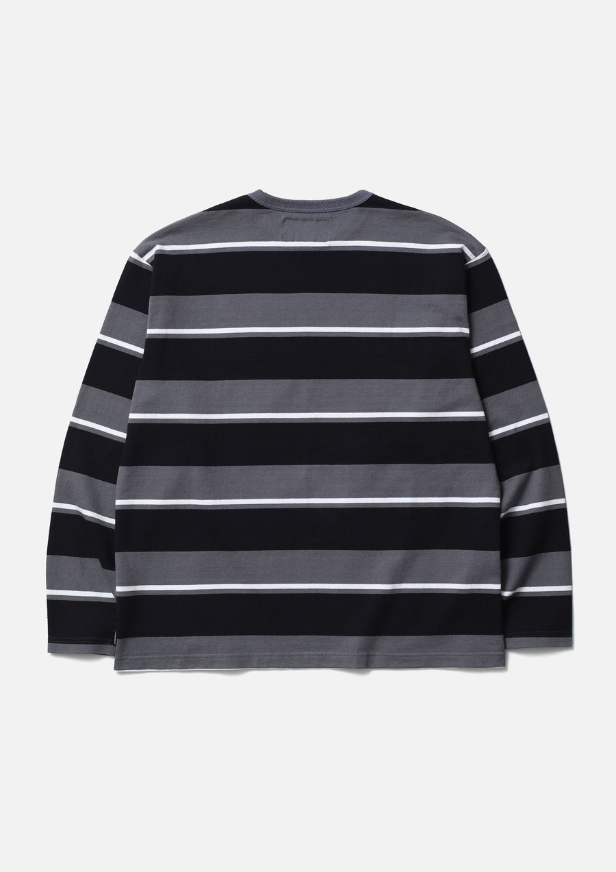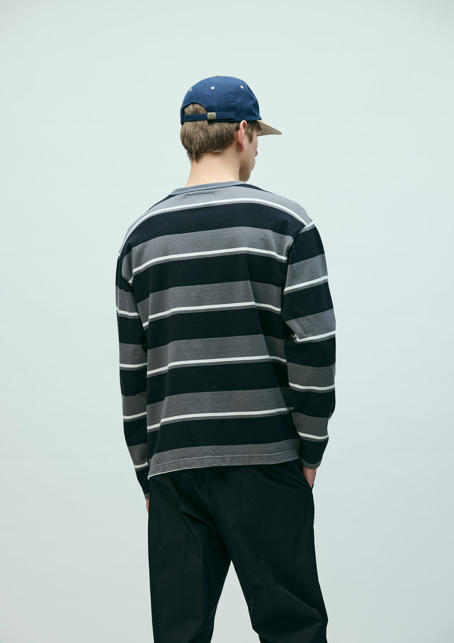 オリジナルボーダーパターンで編み立てた天竺素材の長袖クルーネックカットソー。左胸にロゴプリントを配置。左裾にブランドタグ、脇接ぎにピスネームを付属。ワンウォッシュ仕上げ。
