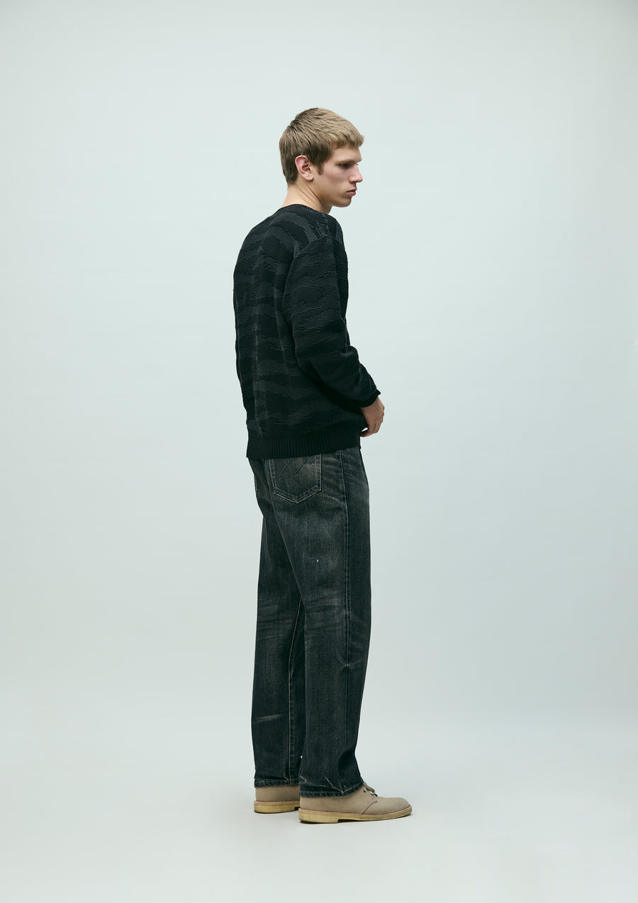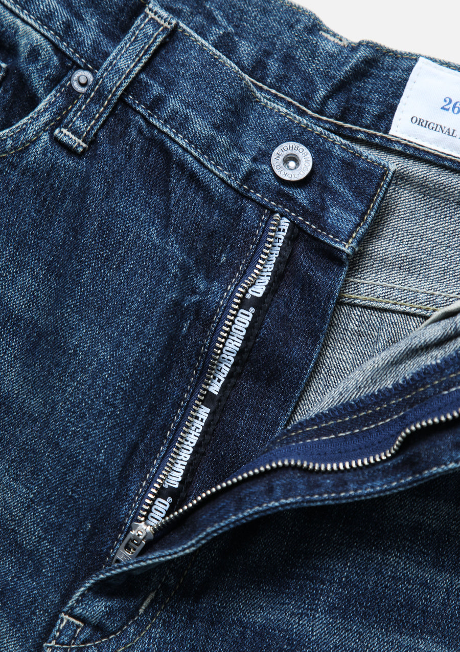 12oz.オリジナルデニムをベースにウォッシュド加工を施したデニムパンツ。セルヴィッヂデニム生地からボタン、リベットといったパーツに至るまで全てオリジナルで製作。フロントジッパーフライに忍ばせたシグネチャーテープやヒップポケットの”N”ステッチ、レザーパッチ等のディティール。カスタムクラフテッドアイテム専用のサイズネームを付属。ワタリ、ヒップ、裾幅にゆとりを持たせつつ裾にかけてややテーパードさせた定番のベーシックシルエット。