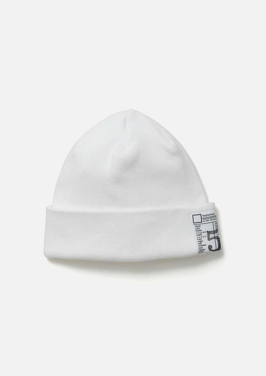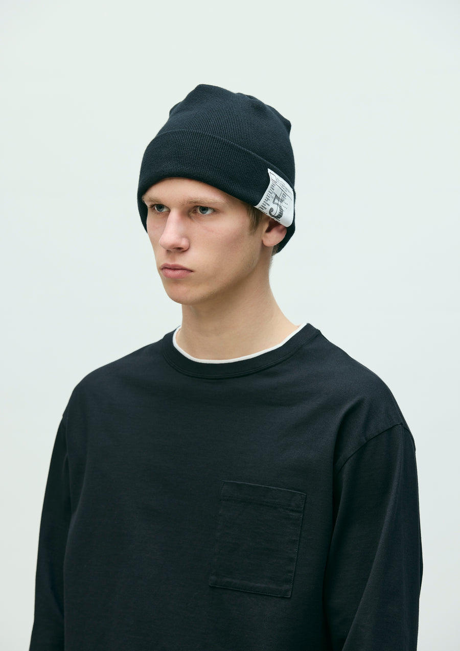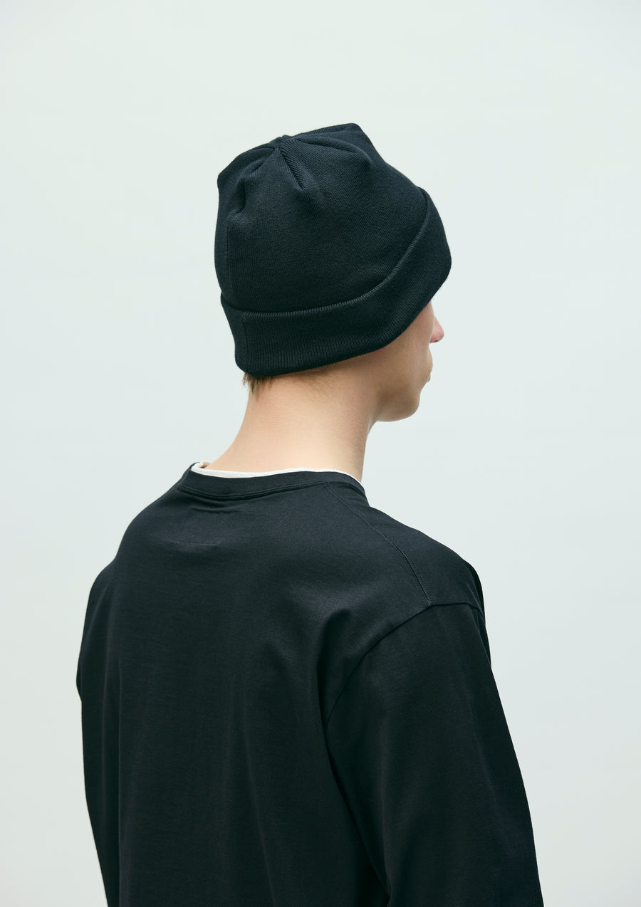 コットン糸で編み立てたビーニー。ユニフォームをコンセプトにもつBLACK & WHITEシリーズ専用のブランドタグを配置。