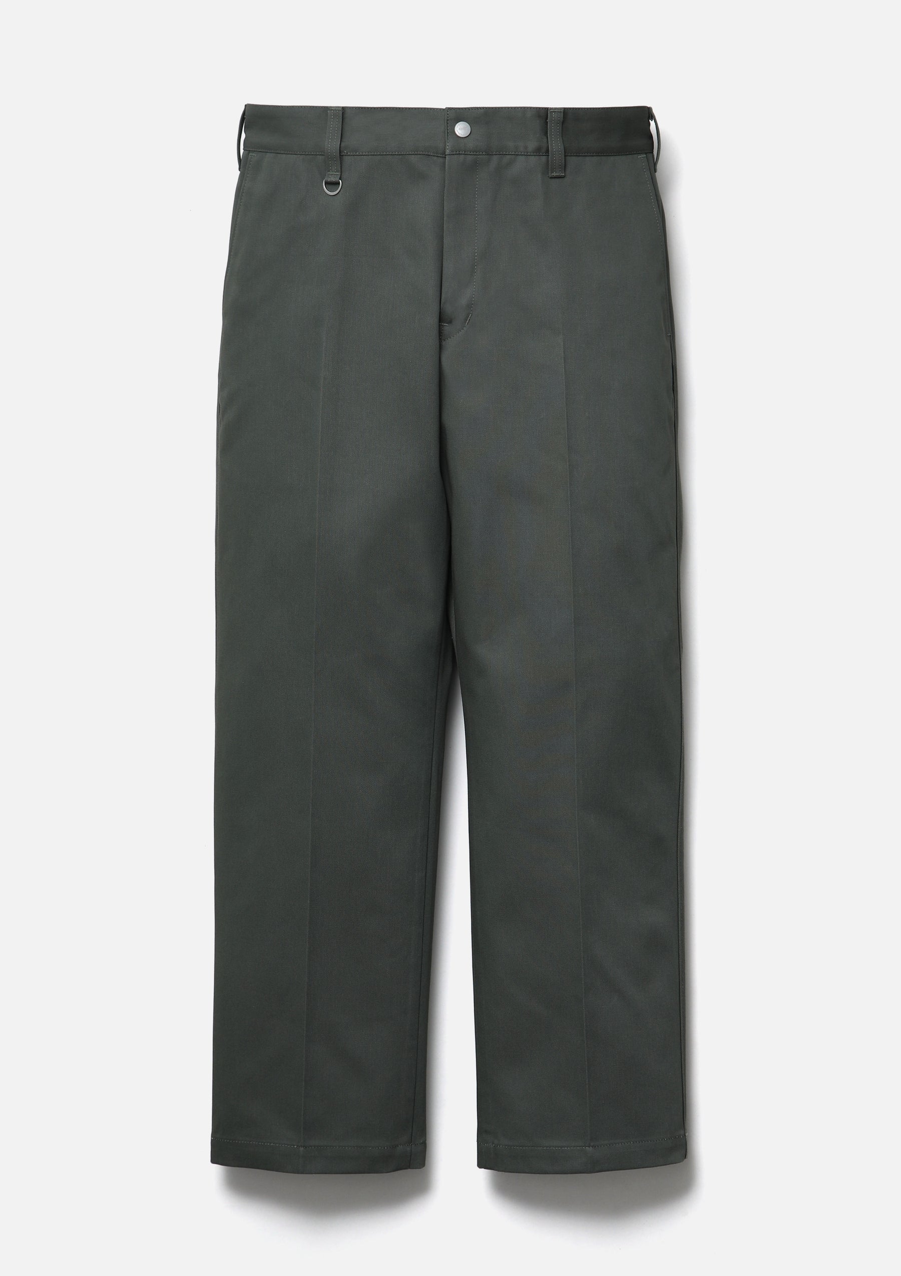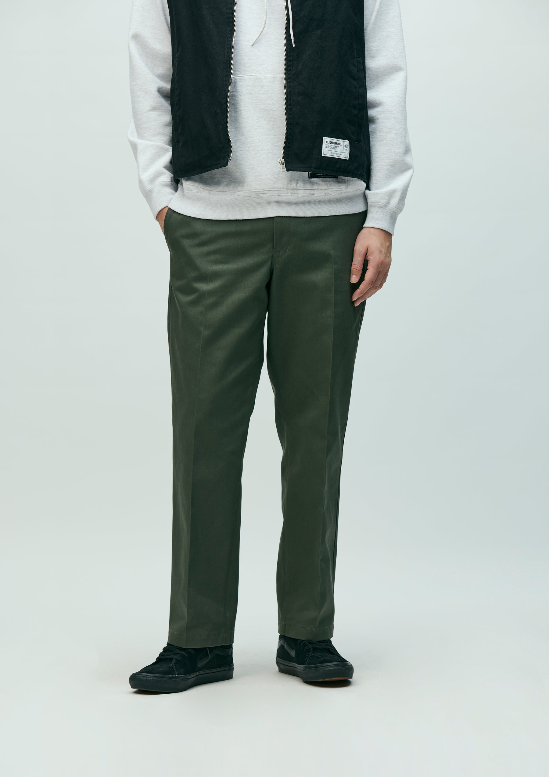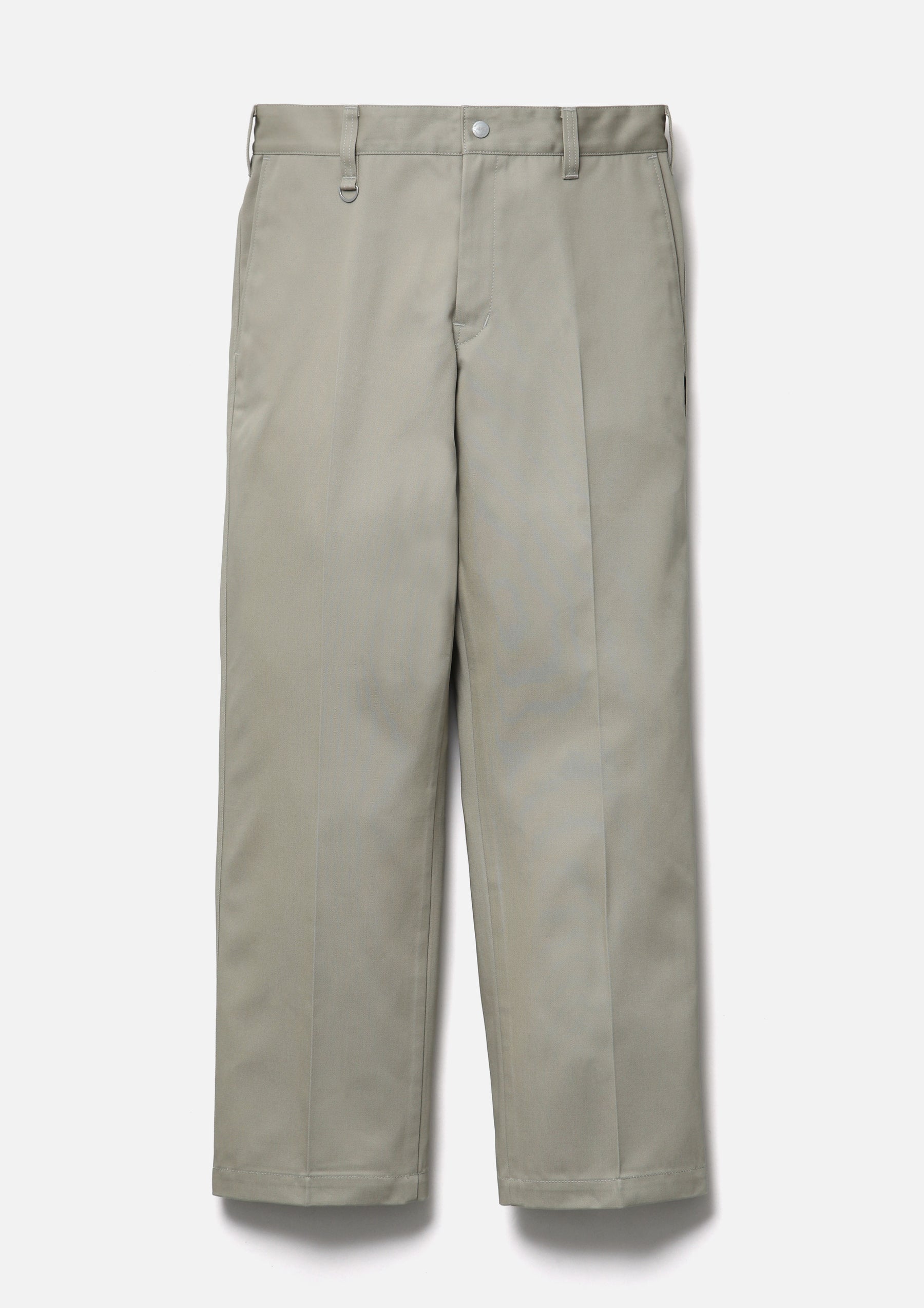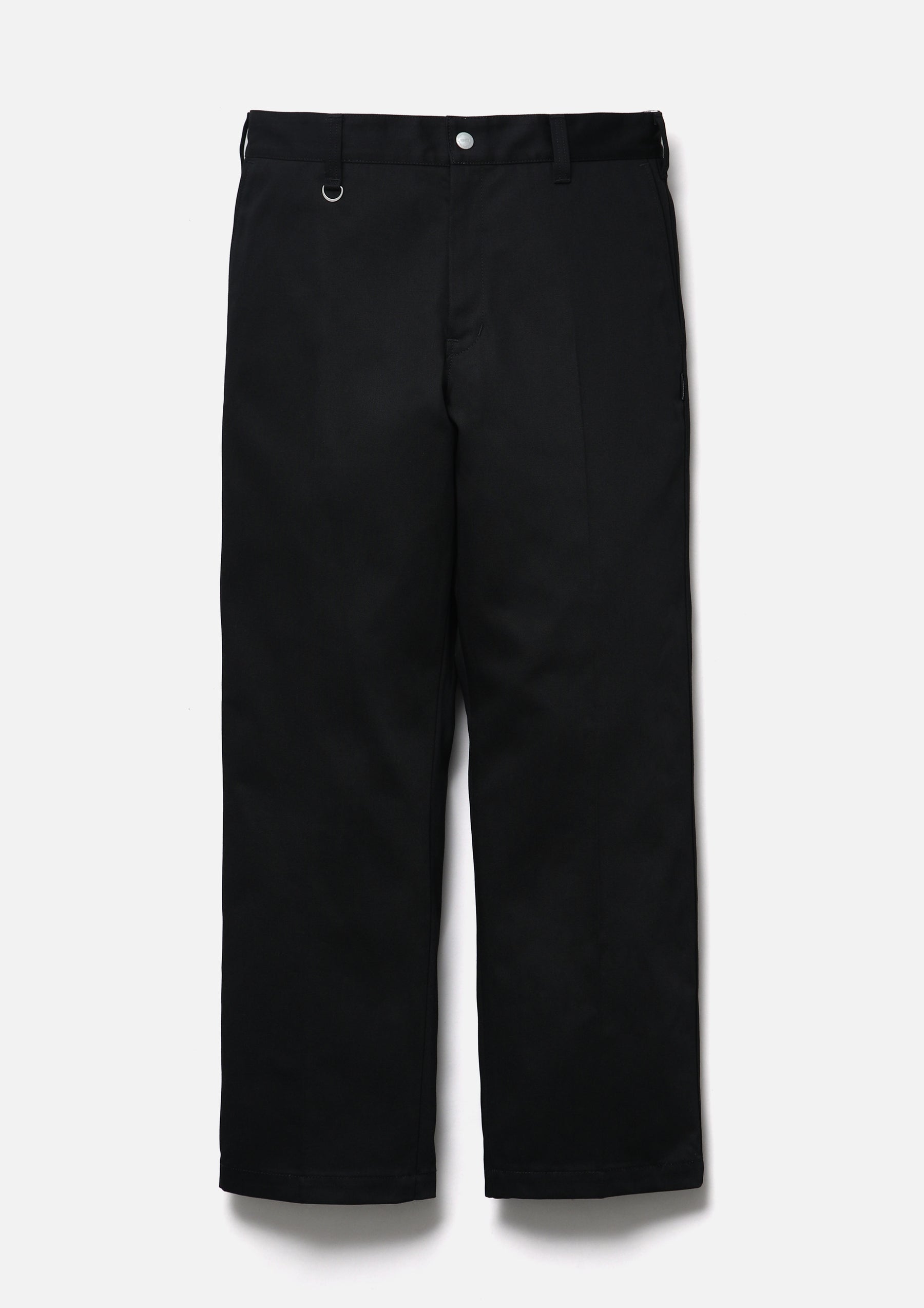 ポリエステル/コットン混紡糸で織り上げた、タフなカツラギ生地のスリムストレートワークパンツ。すっきりとしたスリムシルエット。オリジナルのスナップボタンとスレキ生地を採用。バックポケット口にブランドタグ、脇接ぎにピスネームを付属。